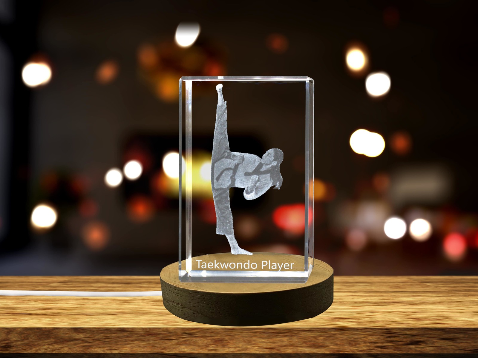 The Taekwondo Player 3D Engraved Crystal Keepsake, a magnificent piece of art that embodies the grace, power, and precision of taekwondo.