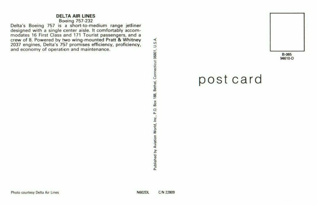 Delta Air Lines Boeing 757 232 Airplane Postcard