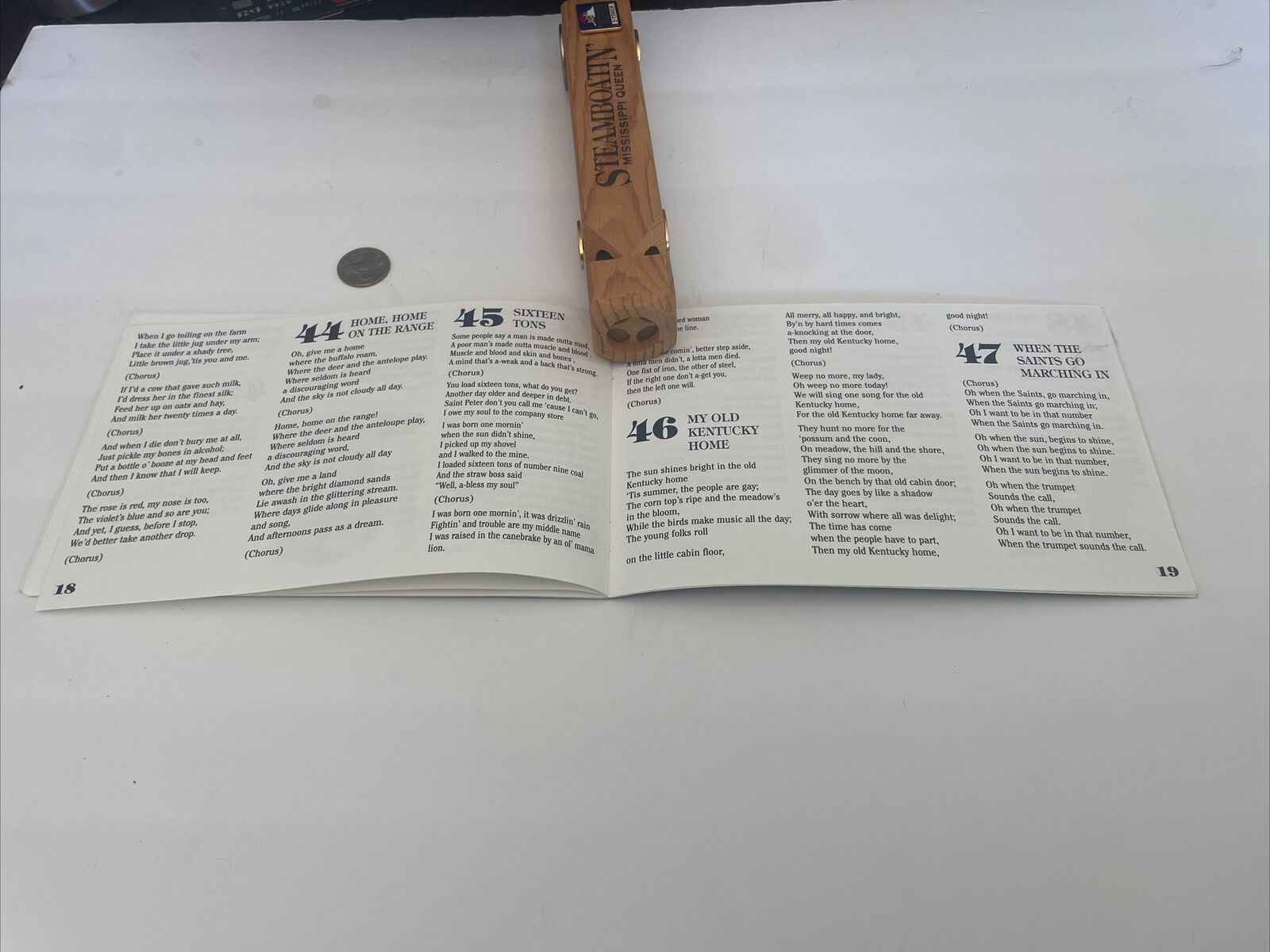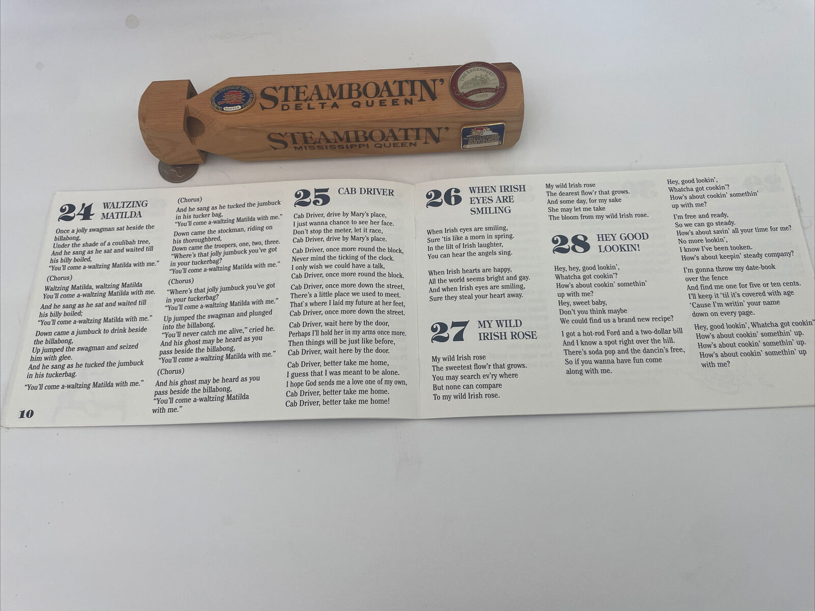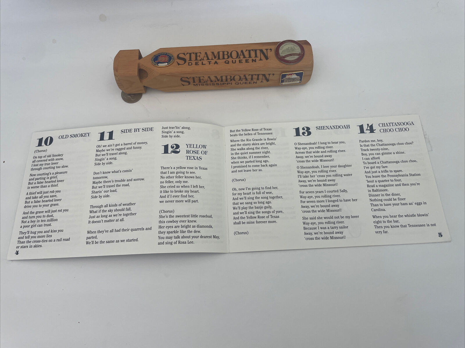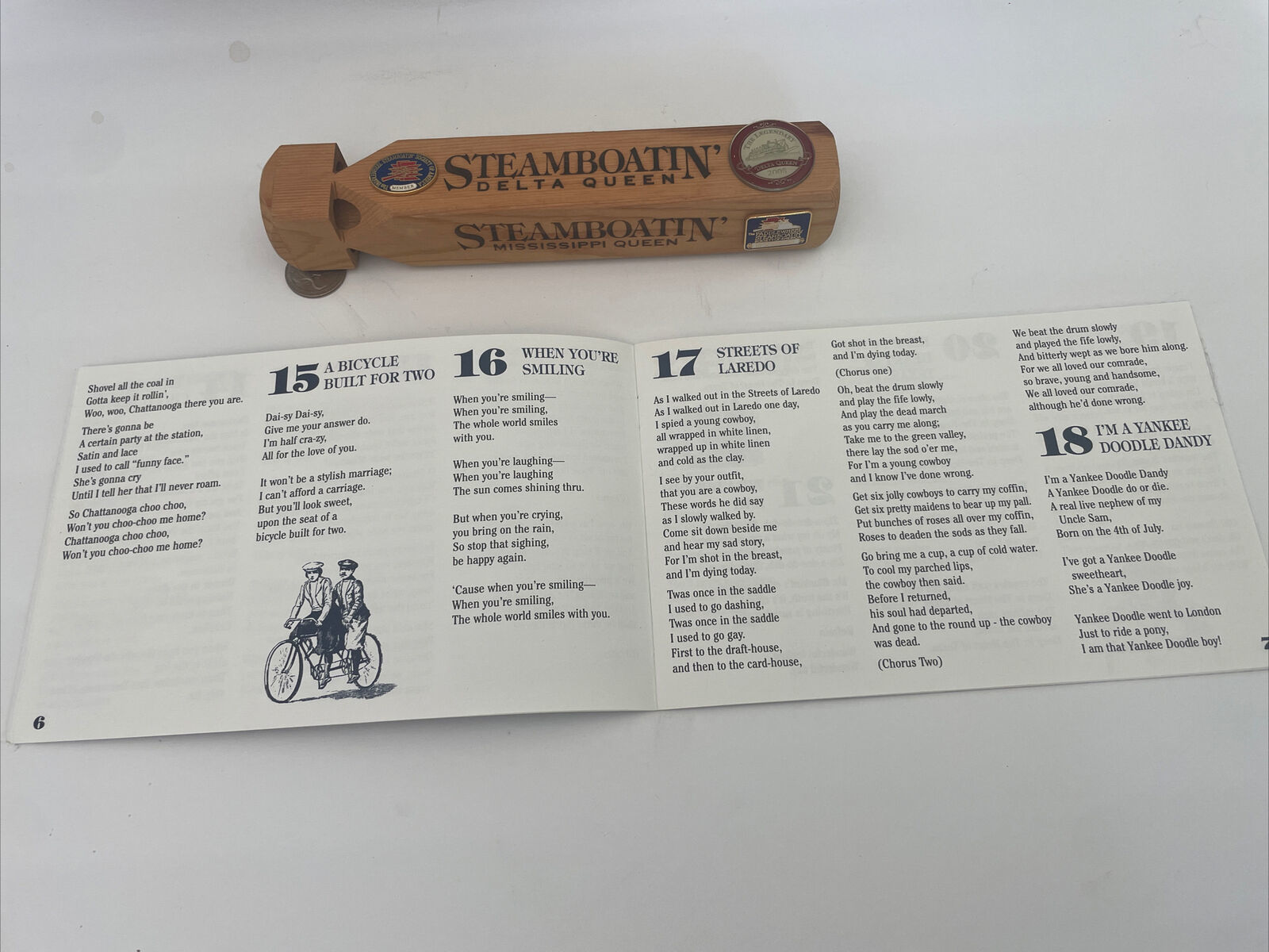 Lot 5 pins, whistle and singalong book with 58 songs Paddlewheel Steamboat Society Whistle Pins Delta Queen Steamboat in?.