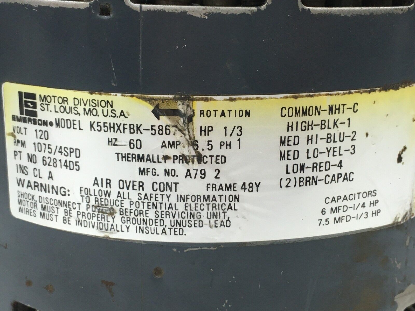 This is EMERSON K55HXFBK-5867 Blower Motor 1/3 HP 1075 RPM 4 SPD 120 V 62814D5 used part.