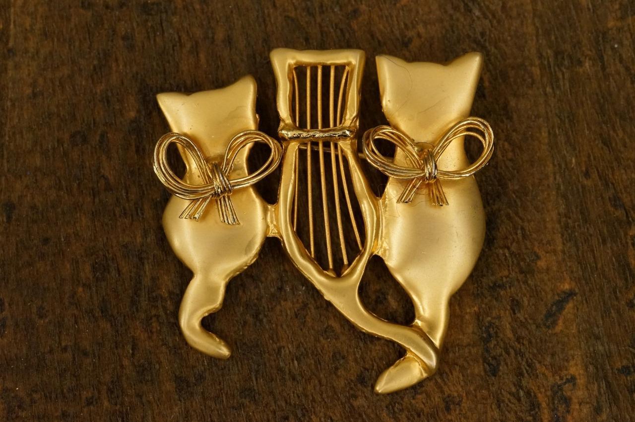 Vintage Costume Jewelry Brassy Gold Tone Metal Three Kitty Cats Brooch Pin