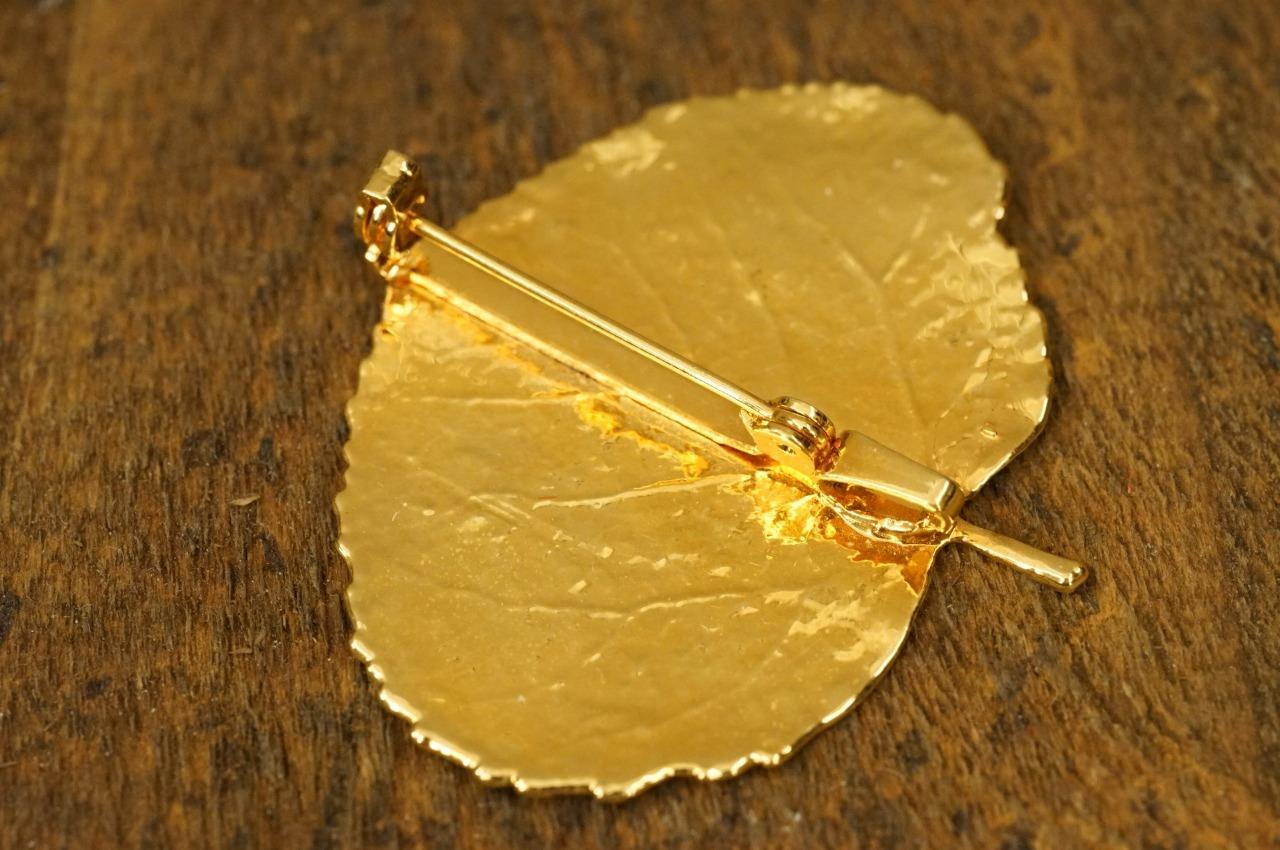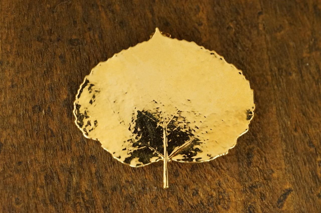 Description: Vintage Costume Jewelry Brassy Gold Tone Metal Dipped Aspen Leaf Brooch Pin. Measures 1.5" by 1.75". Real leaf dipped in gold finish. Dates to the 1970s. No smoke or pet odors.