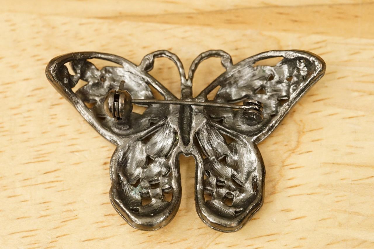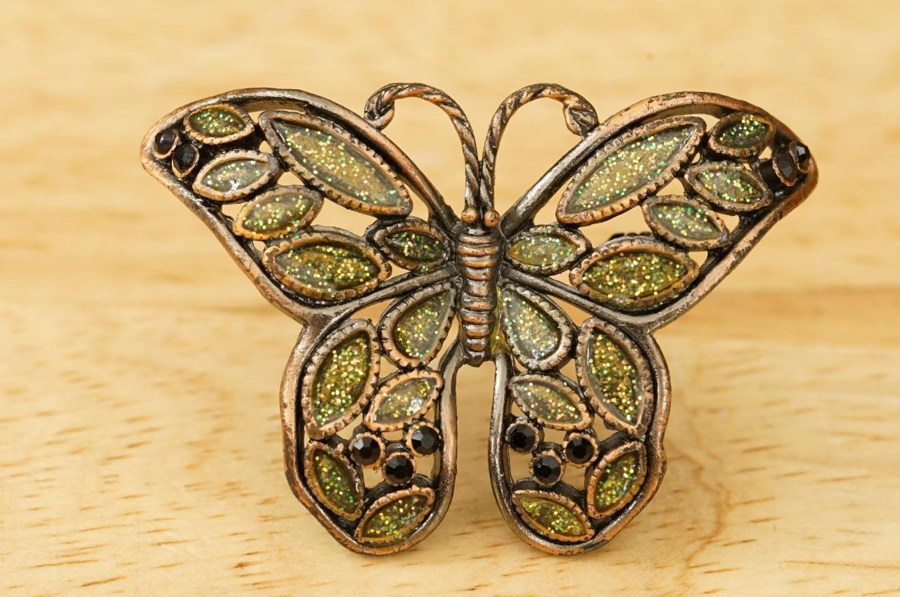 Description: Vintage Costume Jewelry Copper Glitter Green Enamel Butterfly Insect Brooch Pin. Measures 2.25" long by 1-3/8" tall. No smoke or pet odors.
