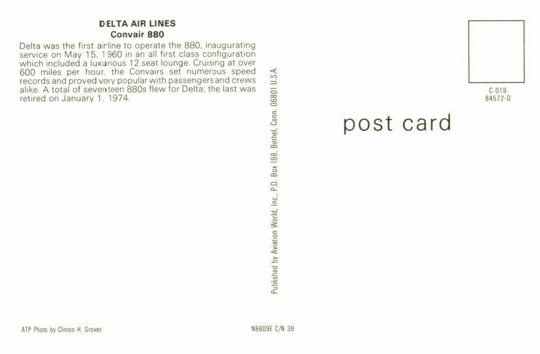 Delta Air Lines Convair 880 Airplane Postcard 1974