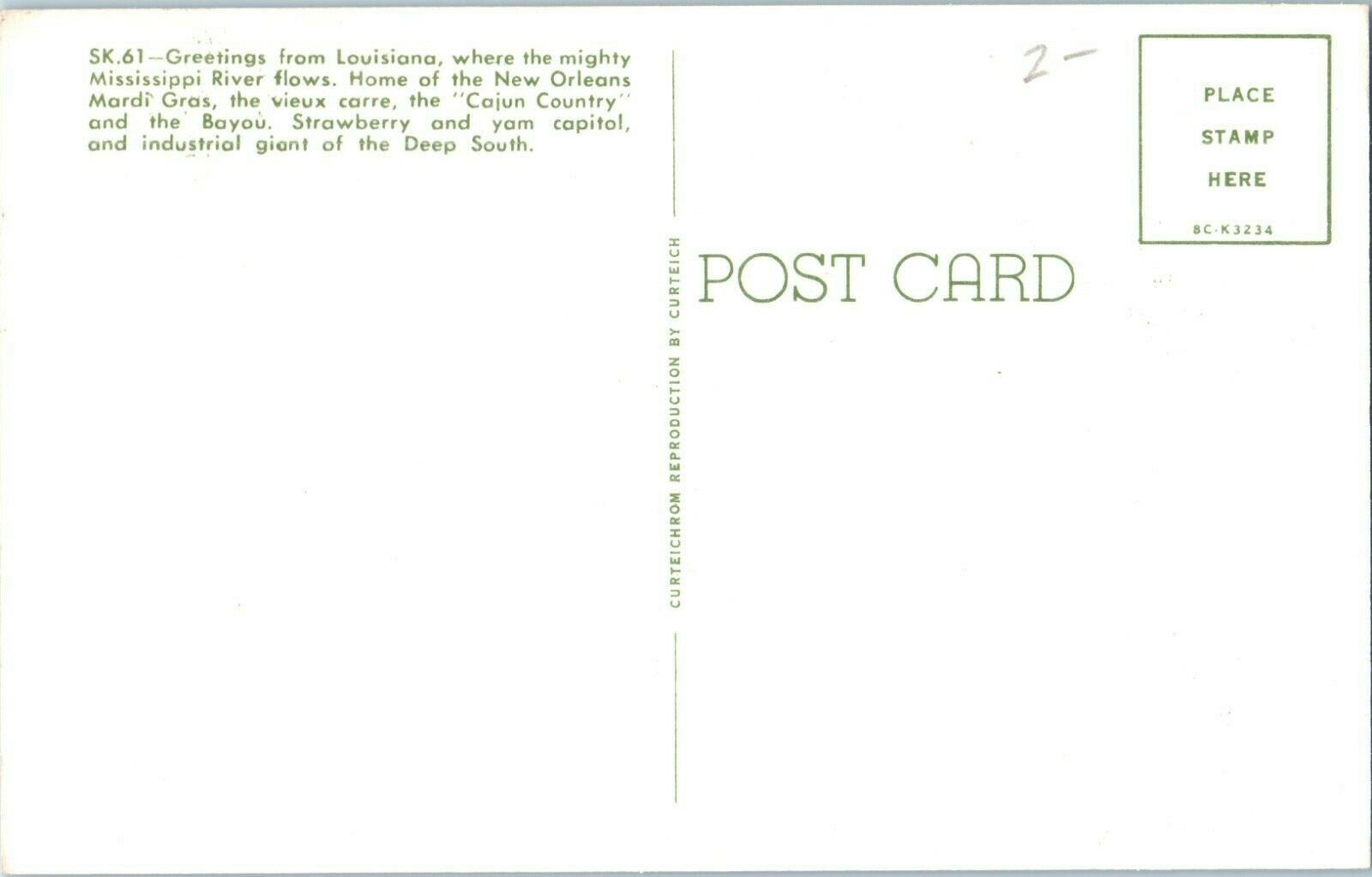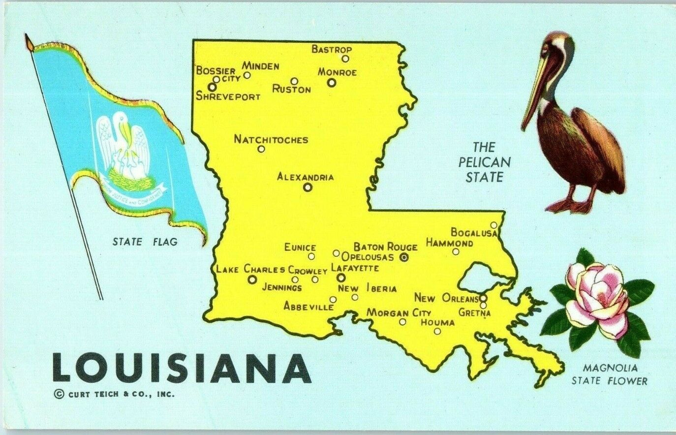 Louisiana State Map w/ Bird Flower Flag Curt Teich Postcard