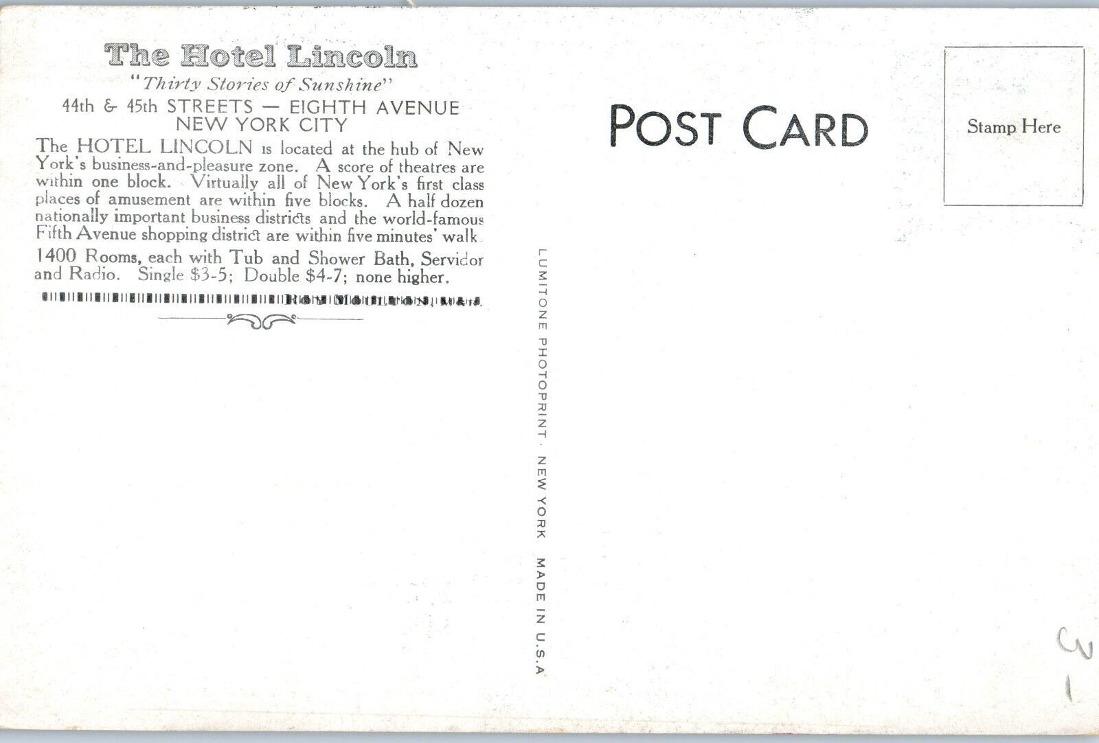 The Hotel Lincoln "Thirty Stories of Sunshine", New York City, New York Postcard