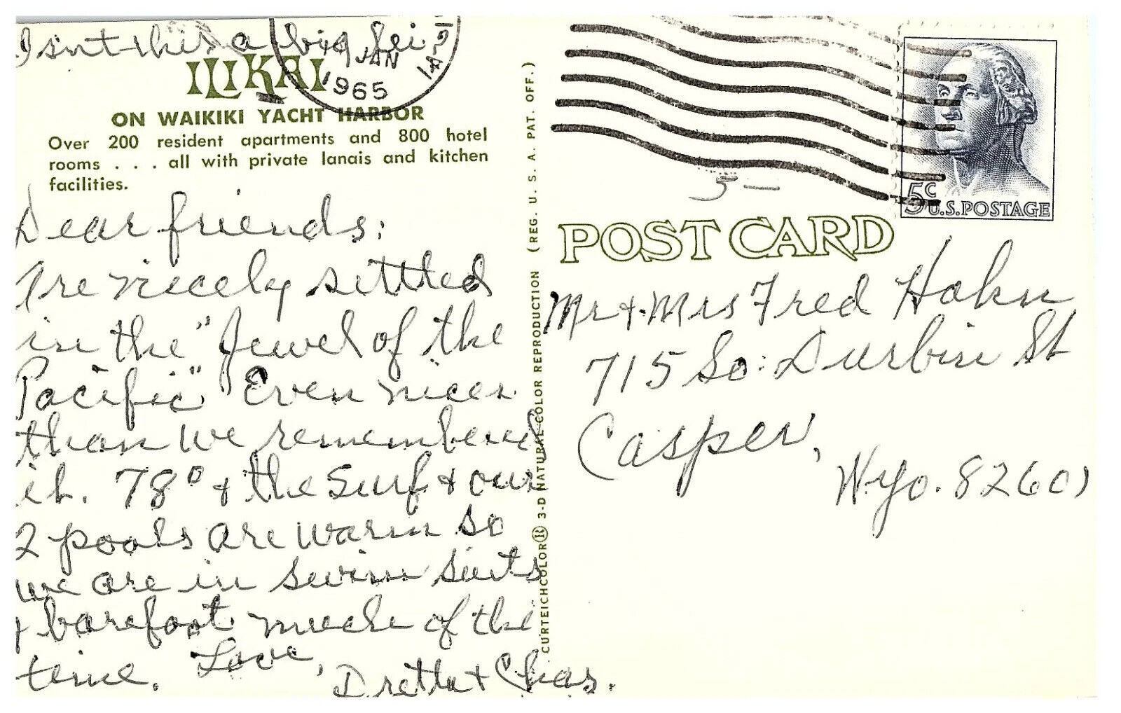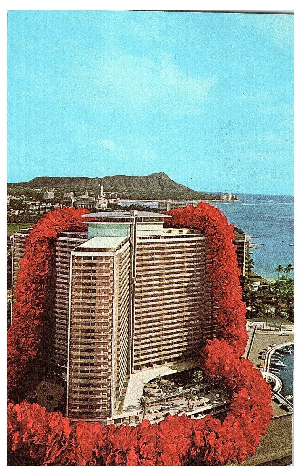 Ilikai Hotel w Big Red Lei Waikiki Beach Diamond Head Hawaii Postcard 1965