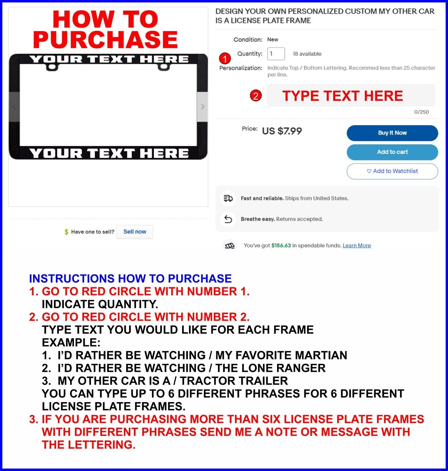 Plastic License Plate Frame for U.S.A. and Canadian vehicles 6" x 12". YOU CAN SEE THE LAST PICTURE OF LISTING WITH INSTRUCTION ON HOW TO PURCHASE ONE OR We ship all of our orders with the United States Postal Service, 1-3 day first class mail with tracking. First class mail with tracking normally arrives within 7 to 15 days from date of purchase. First class mail normally arrives within 15 to 30 days from date of purchase. We are NOT AFFILIATED with anyone pertaining to any designs except, aside from our own artistic creative rendition of said items. Therefor these license plate frames are NOT an Official Licensed Product. It is merely a "Novelty" item for that car/truck enthusiast. Our items are ?handmade". Please contact before leaving any negative feedback. I will fix if anything is w