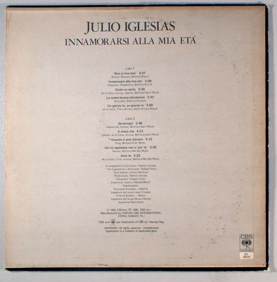 Innamorarsi Alla Mia Eta, by Julio Iglesias, is the Italian version of his original Spanish album Emociones. The record reached No. 1 on the weekly Italian music charts and No. 6 for the year-end charts. It sold 1,500,000 copies in Italy alone. Iglesias recorded the album in French and Spanish as well. Innamorarsi Alla Mia Eta (Emociones) was undoubtedly an international hit. Iglesias is recognized as the most commercially successful Spanish singer in the world and one of the top record sellers in music history, having sold more than 100 million records worldwide in 14 languages.