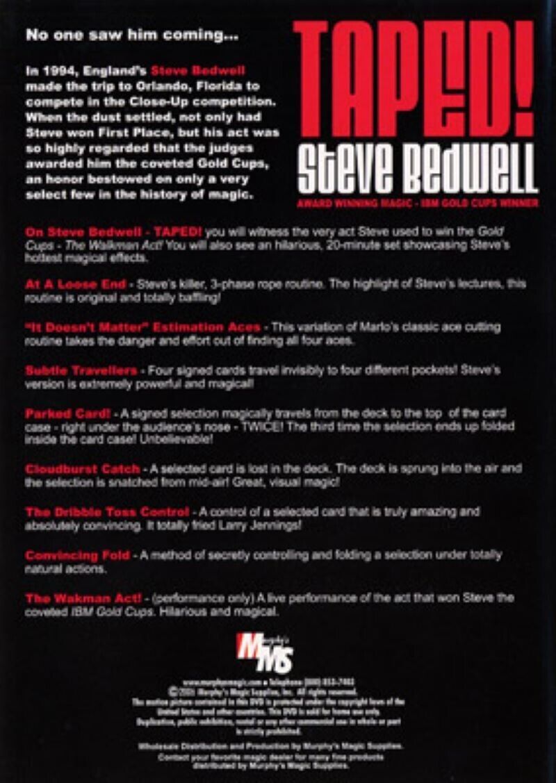 On Steve Bedwell - TAPED! you will witness the very act Steve used to win the Gold Cups - The Walkman Act! You will also see a hilarious, 20-minute set showcasing Steve's hottest magical effects.
