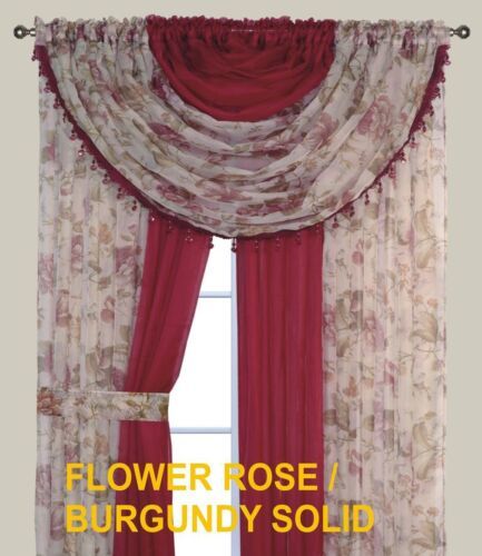 FLOWERS ROSE BURGUNDY LAURA DECORATIVE SHEER WINDOWS PANELS CURTAINS 8 PCS
