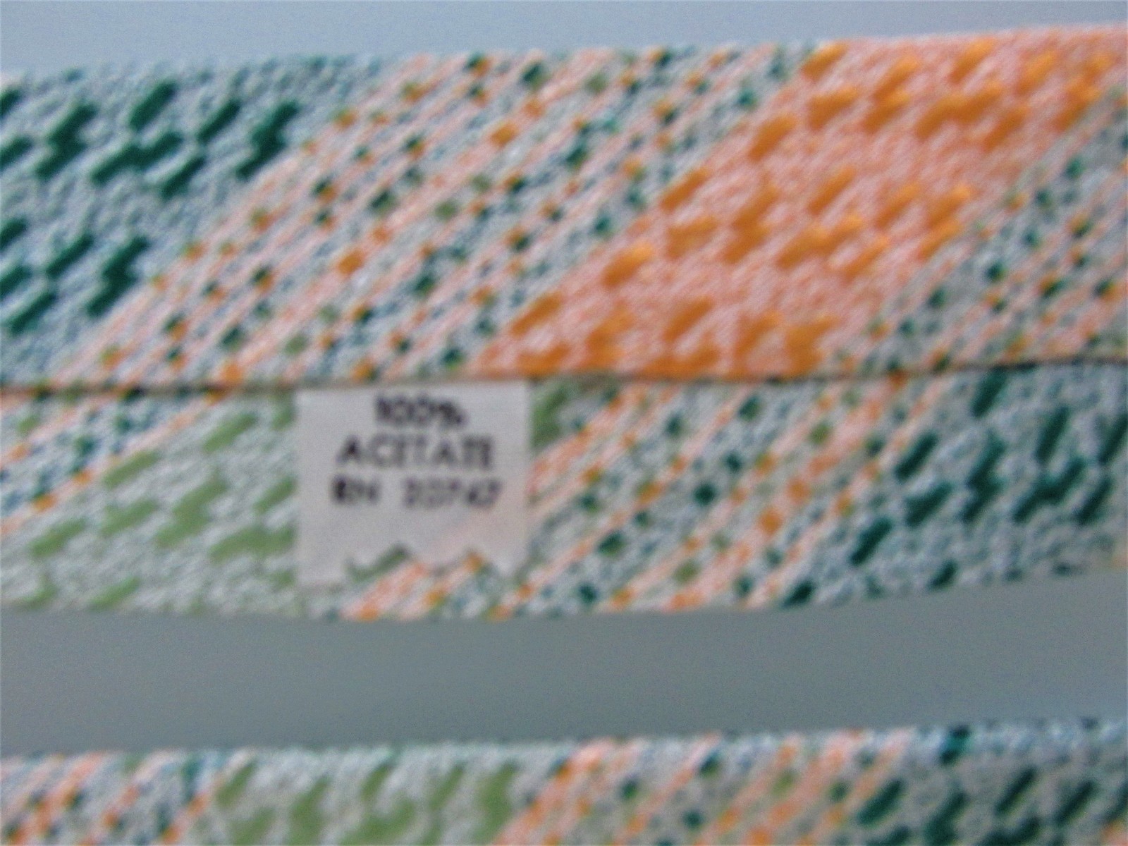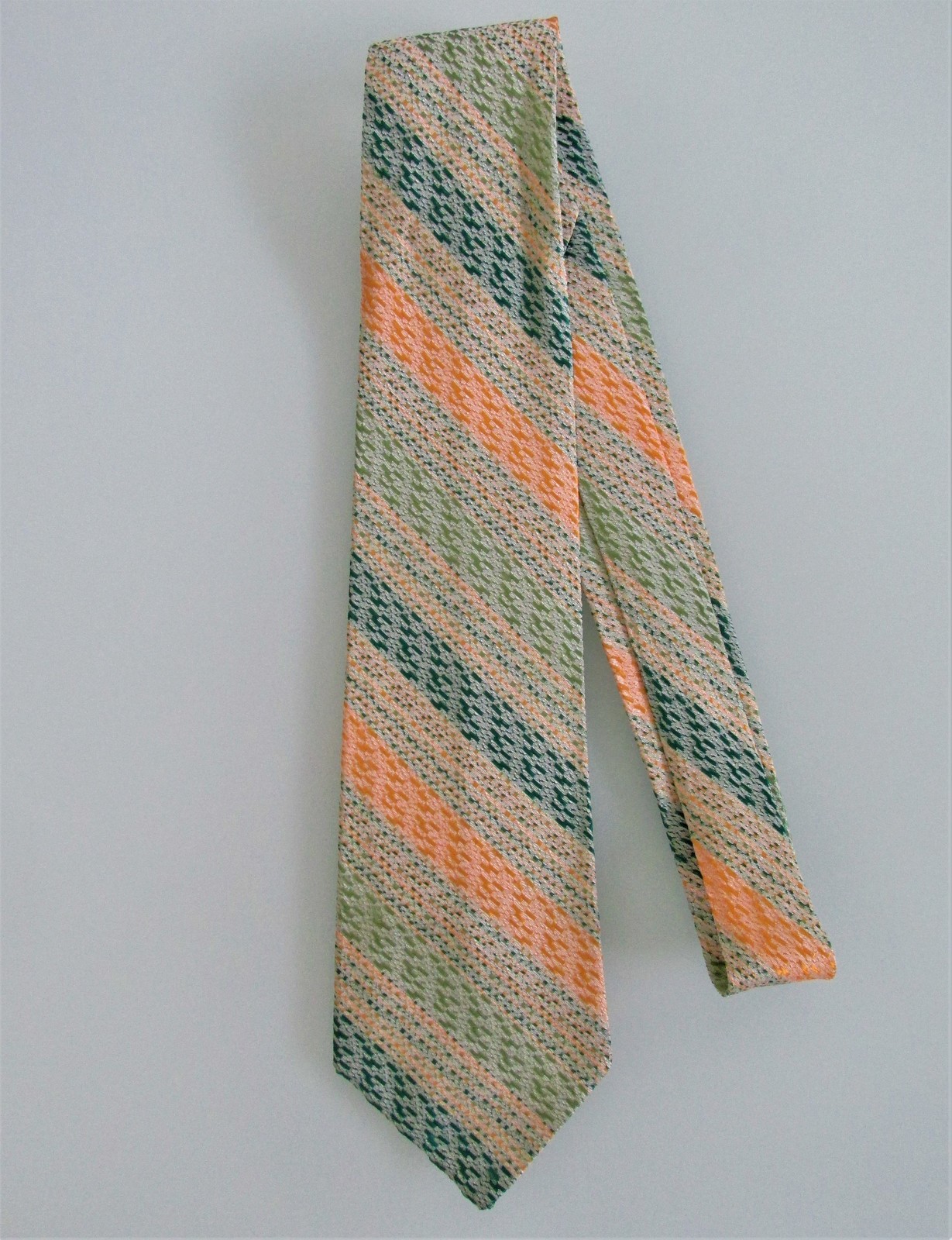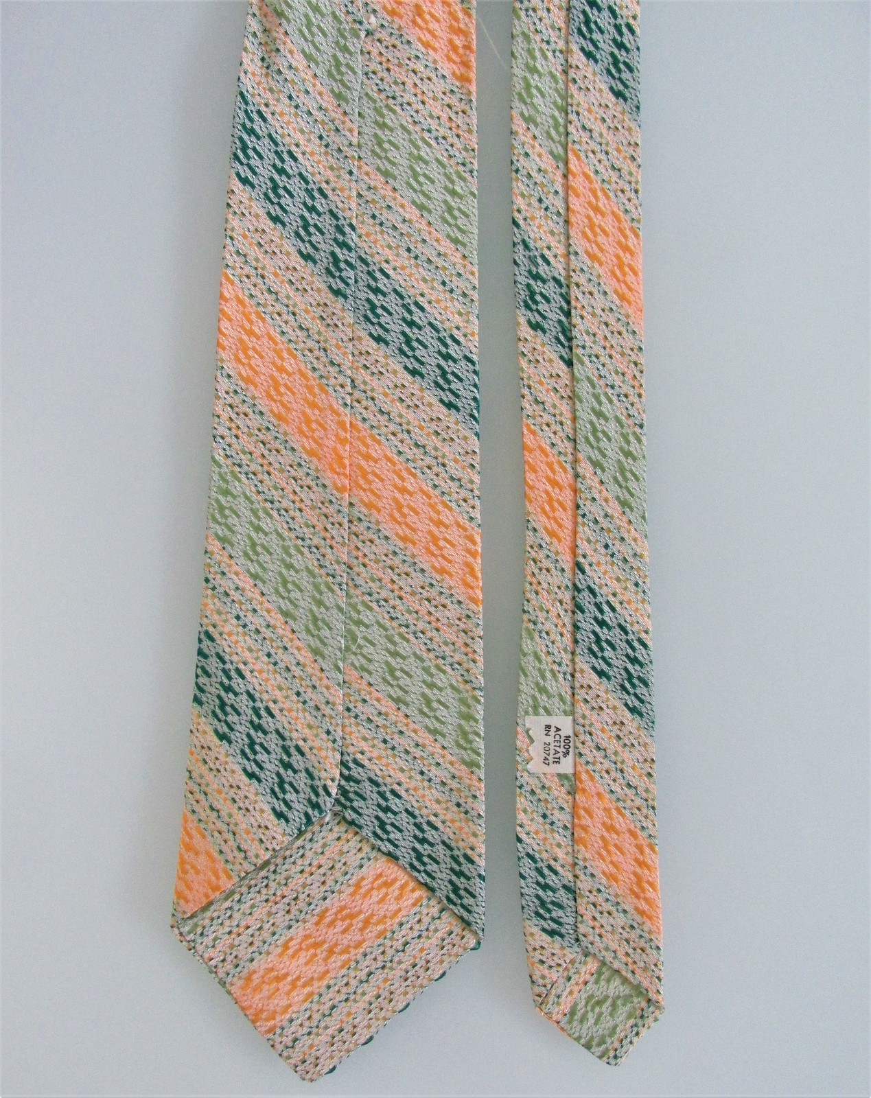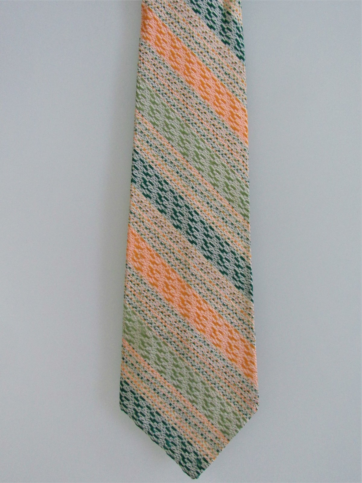 Description: Up for sale is a vintage men's (NWOT) acetate tie. This tie is made in the USA of 100% textured acetate. The tie has a multicolored striped design in shades of green with gold white. Dimensions are approximately 54" long x 3.25" wide. This tie is probably from the 1950s-60s.