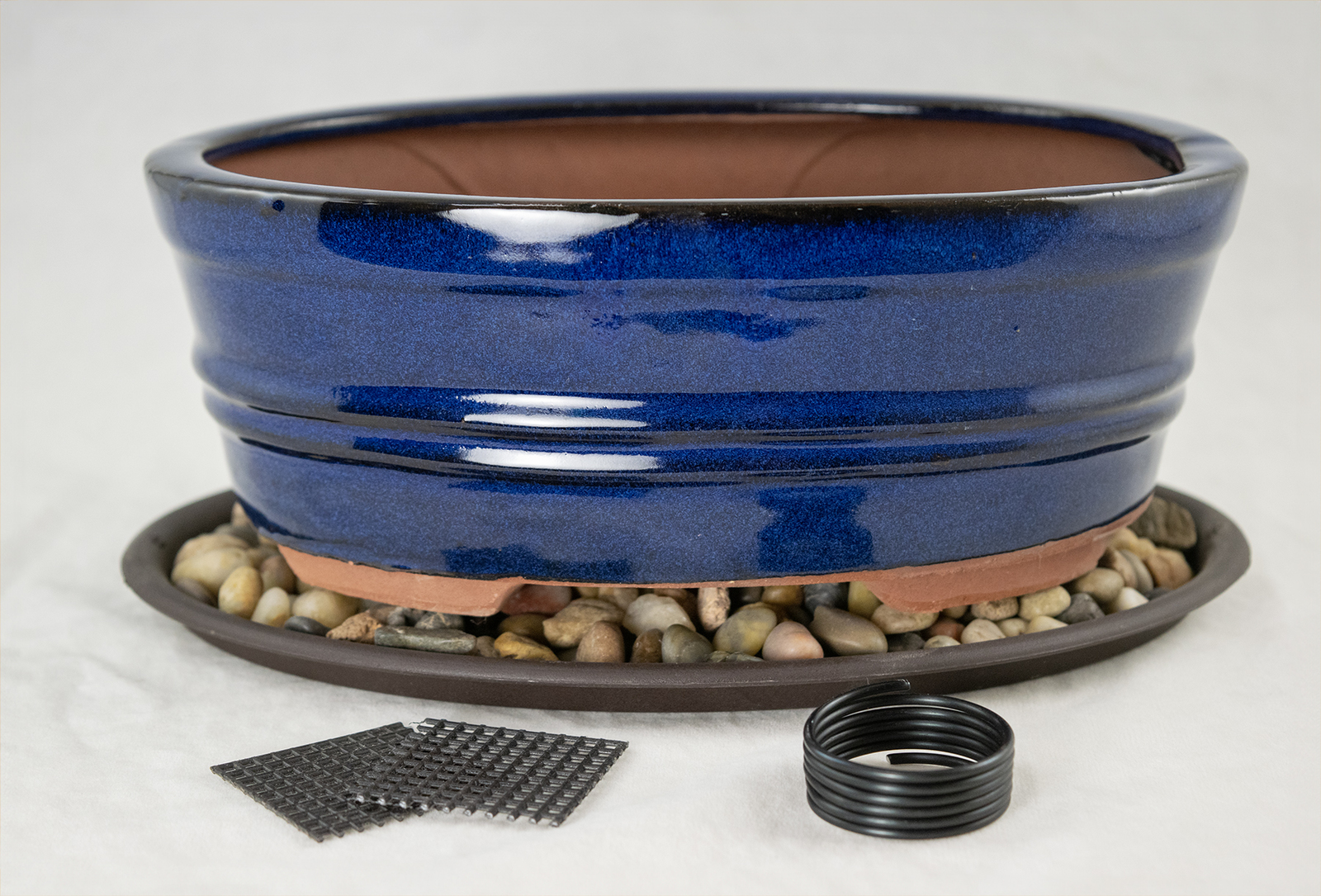 Oval Blue Shohin Bonsai, Succulent Pot + Tray, Rock, Mesh & Wire Combo 5"- 8.25