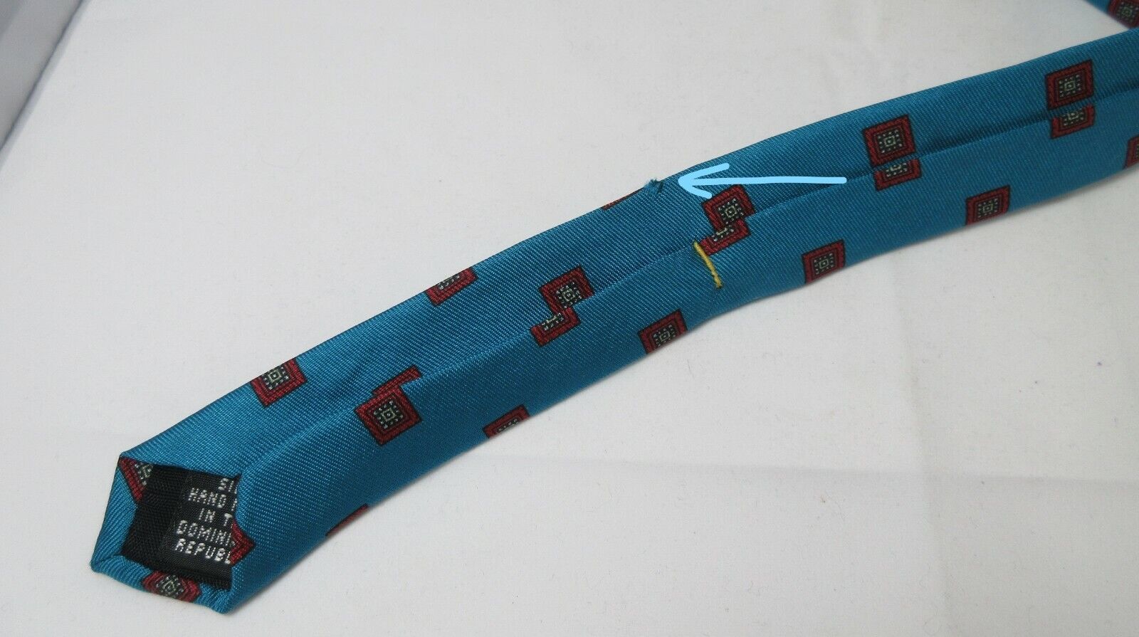 Brand: Claybrooke Length: 59" Width: 3.25" Pattern: Squares Color: Blue Materials: 100% Silk Condition: Good condition. Comments: Good condition. Tiny hole at the skinny side shown with arrow in photo. Per used clothing policy, all items have been cleaned.