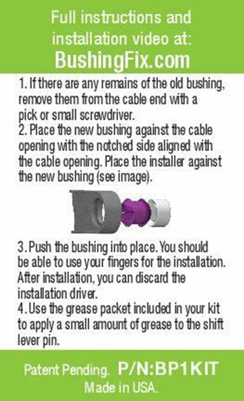 The patented (US patent #10,619,723 and #10,215,273) custom molded replacement bushing ensures a quality repair with ease. A professional can perform this repair in under 5 minutes, average time for a non-professional is less than 10 minutes. This bushing is made from a material that was designed to outlast the factory bushing and includes everything needed to install.