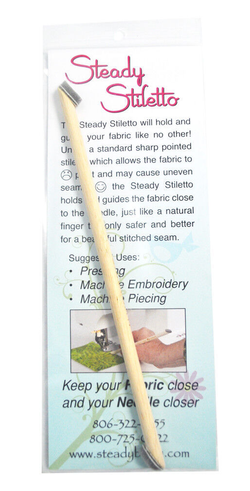 The must have tool for achieving Perfectly Stitched Seams. Steady Stiletto will hold and guide your fabric like no other! Unlike a standard sharp pointed stiletto which allows the fabric to pivot, causing uneven seams. Steady Stiletto holds the fabric just like a natural finger tip, only better. Suggested Uses: Pressing, Machine Embroidery, Machine Piecing. Stiletto is approximately 9 1/4 inches long.