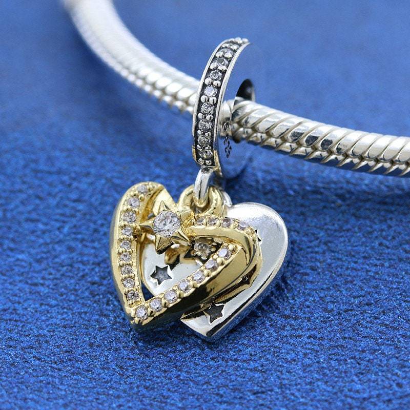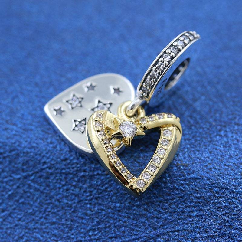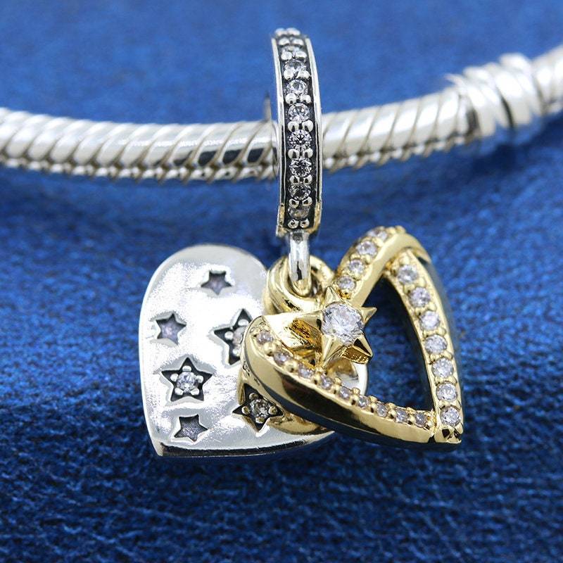 Two-tone 925 Silver & 14k gold plating Shooting Star Hearts Double Dangle Charm