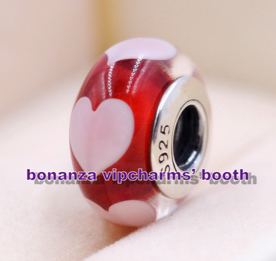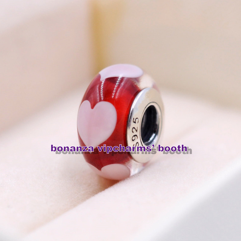 Sterling Silver Handmade Glass Bead Red Love with Pink Hearts Murano Glass Charm