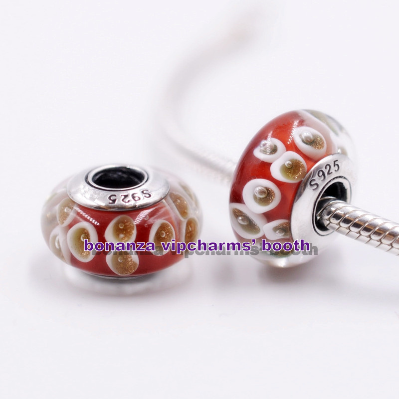 TOP 925 Sterling Silver Handmade Glass Bead Shiny Red & Gold Murano Glass Charm