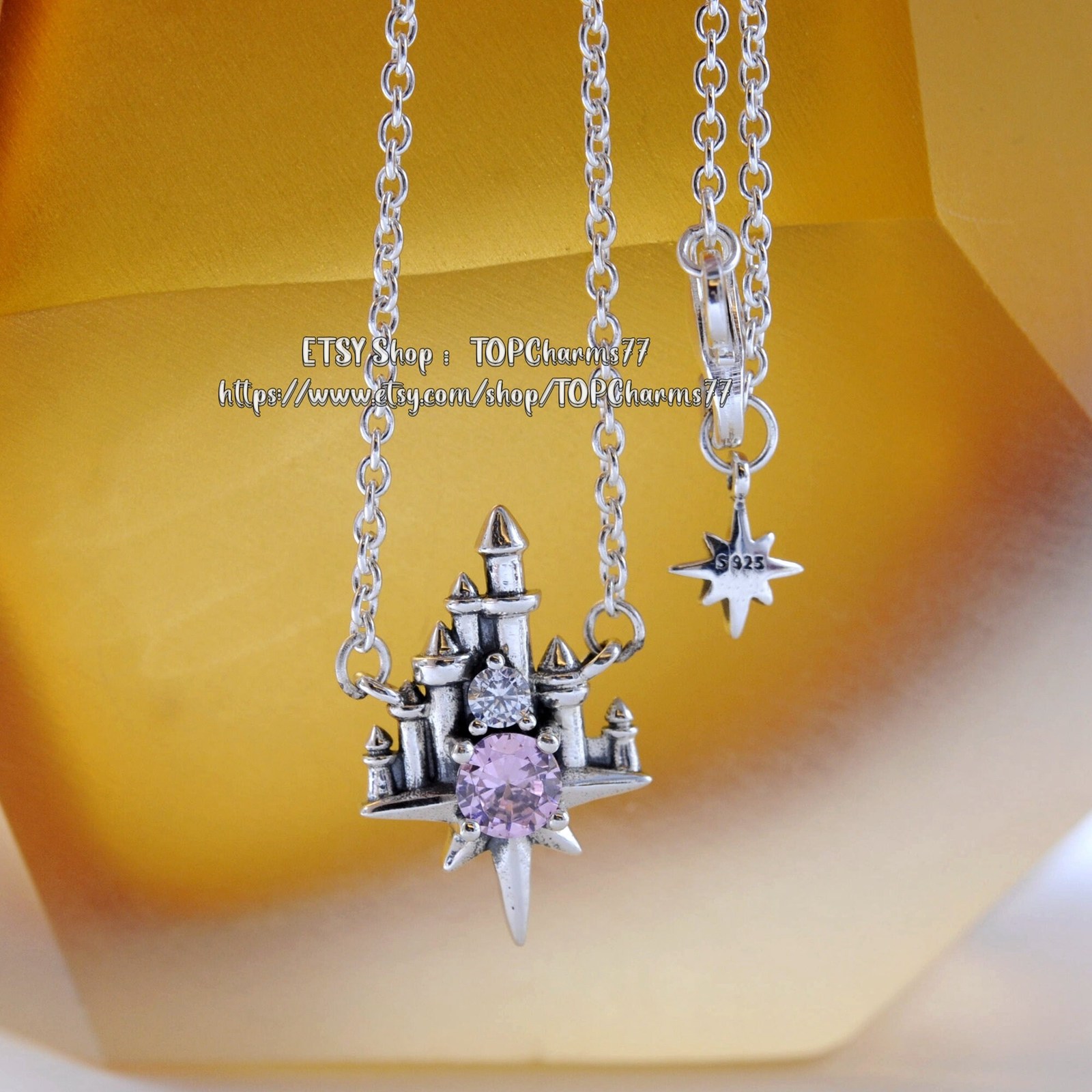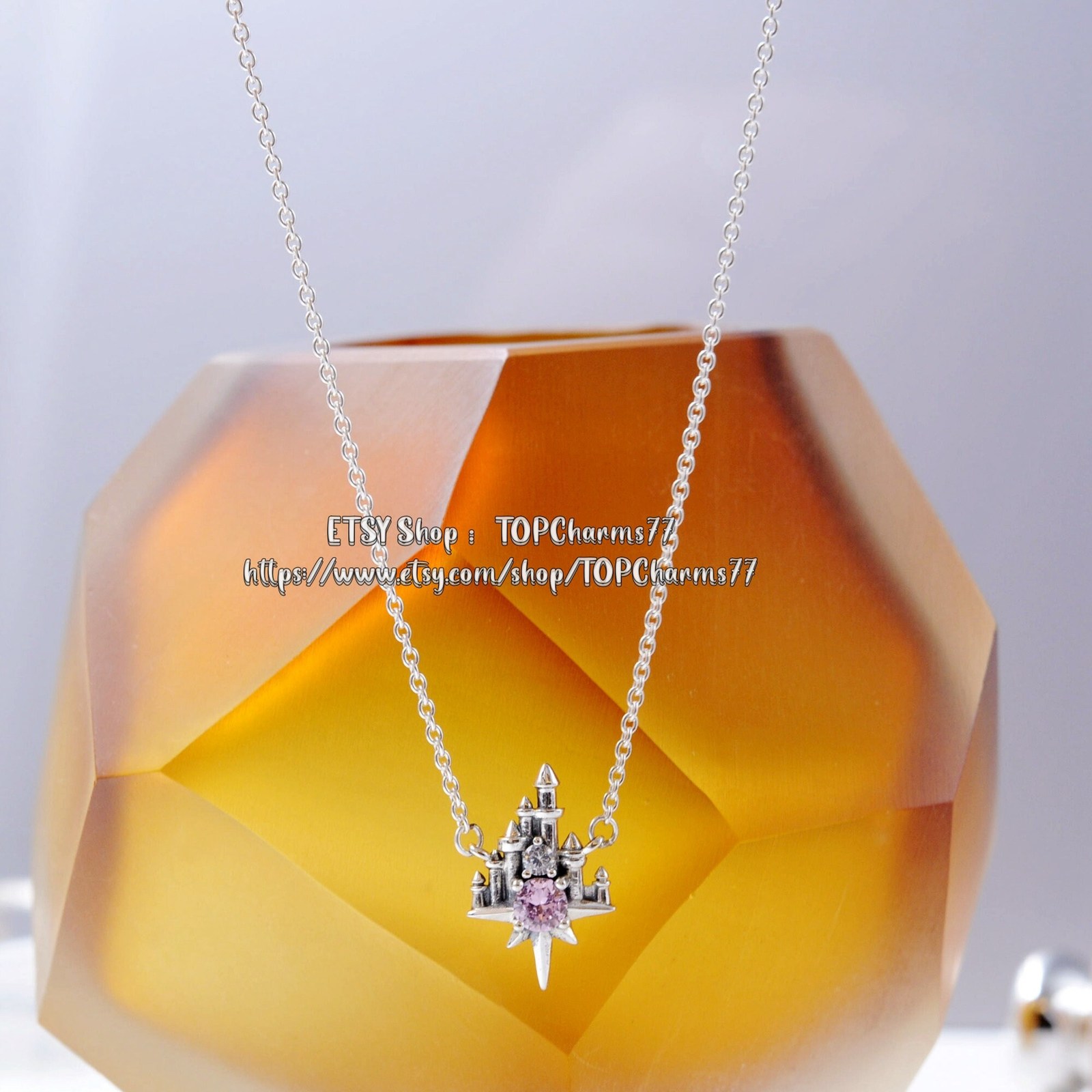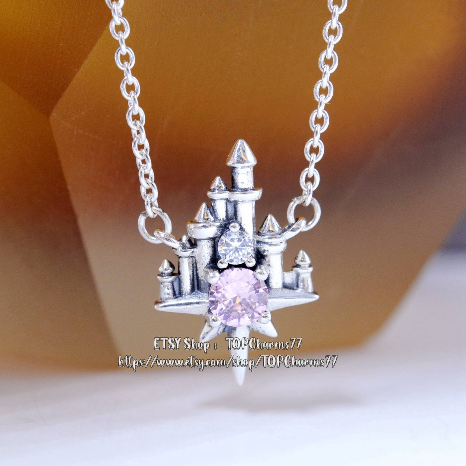 Pink and clear cubic zirconia stones sparkle in front of the Fantasyland Castle on this necklace Jewelry. The figural pendant, inspired by the popular attraction, will be a dazzling reminder of your trips to the Disney Parks.