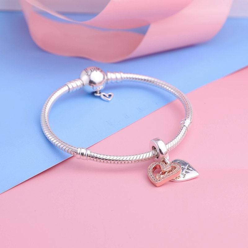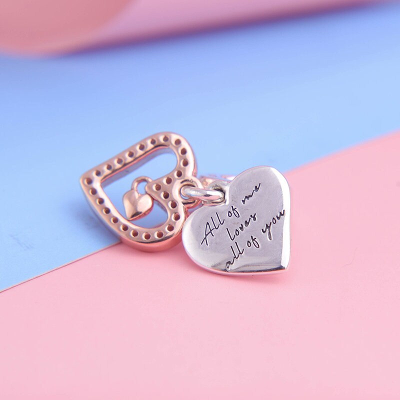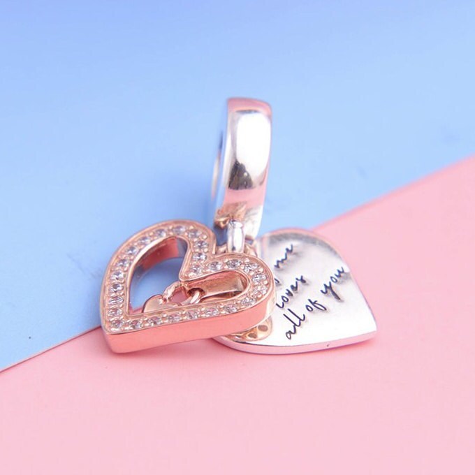 Two hearts are better than one. This two-tone Sparkling Freehand Heart Dangle Charm reminds someone that “all of me loves all of you”, as its engraving says. 26 brilliant-cut clear cubic zirconia adorn a freehand heart motif in Rose (14k rose gold-plated unique metal blend), encircling a tiny heart. Behind this heart sits a sterling silver pendant with an engraving. It's the perfect gift to show your love for another or yourself.