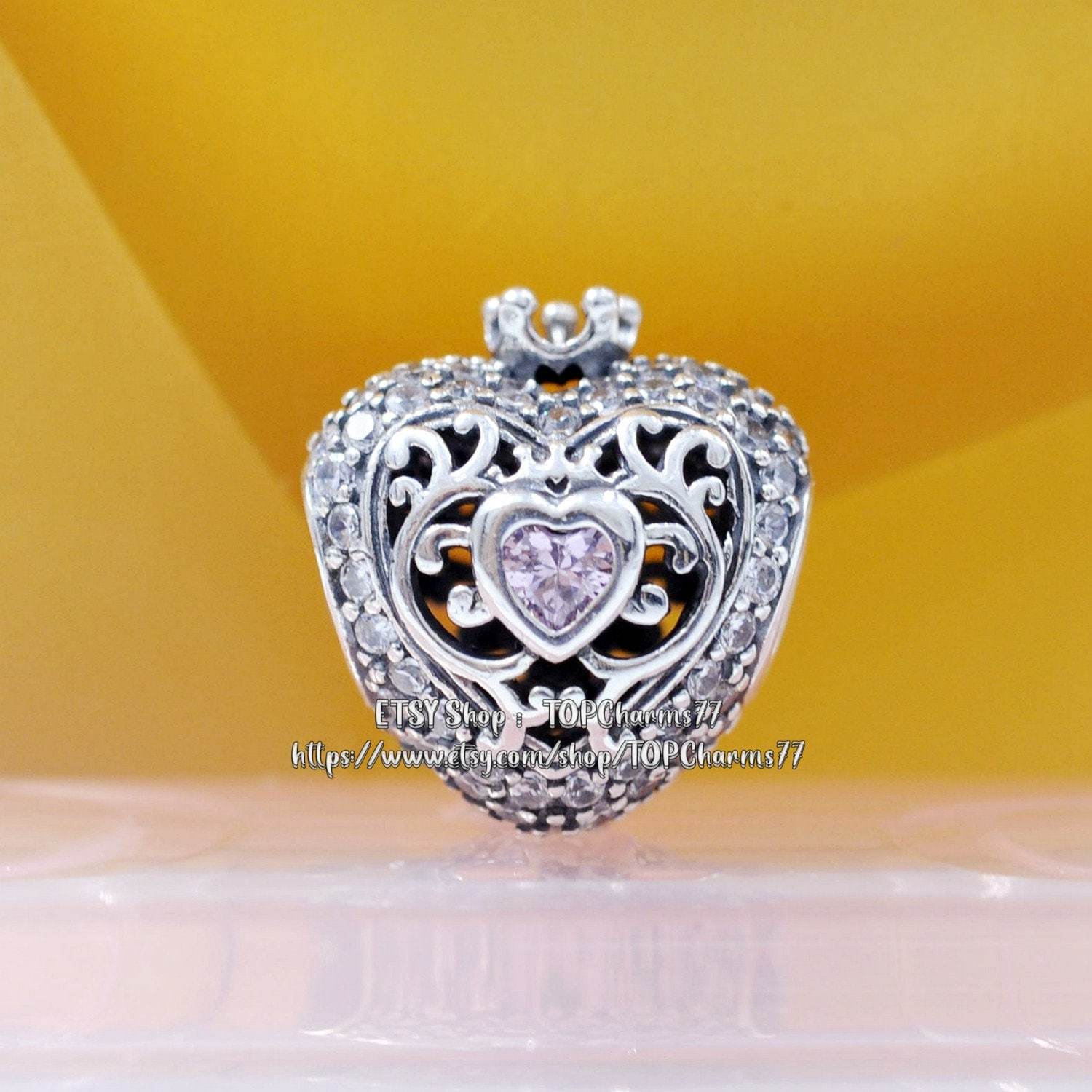 Fall in love with our majestic Regal Crown and Heart Charm. Sparkling pink cubic zirconia sits at the center of a heart-shaped sterling silver charm. Cut-out filigree, brilliant-cut clear cubic zirconia and small five-point crown at the top of the charm contribute to the fairy-tale feel and royal theme. Add this charm as the crowning glory on your bracelet for a regal moment every day, and style it with other sterling silver pieces.