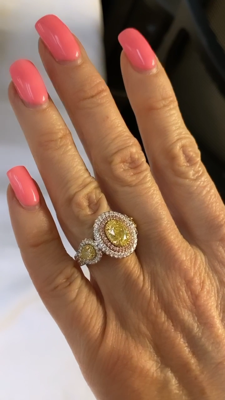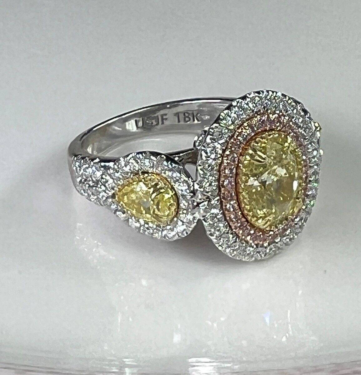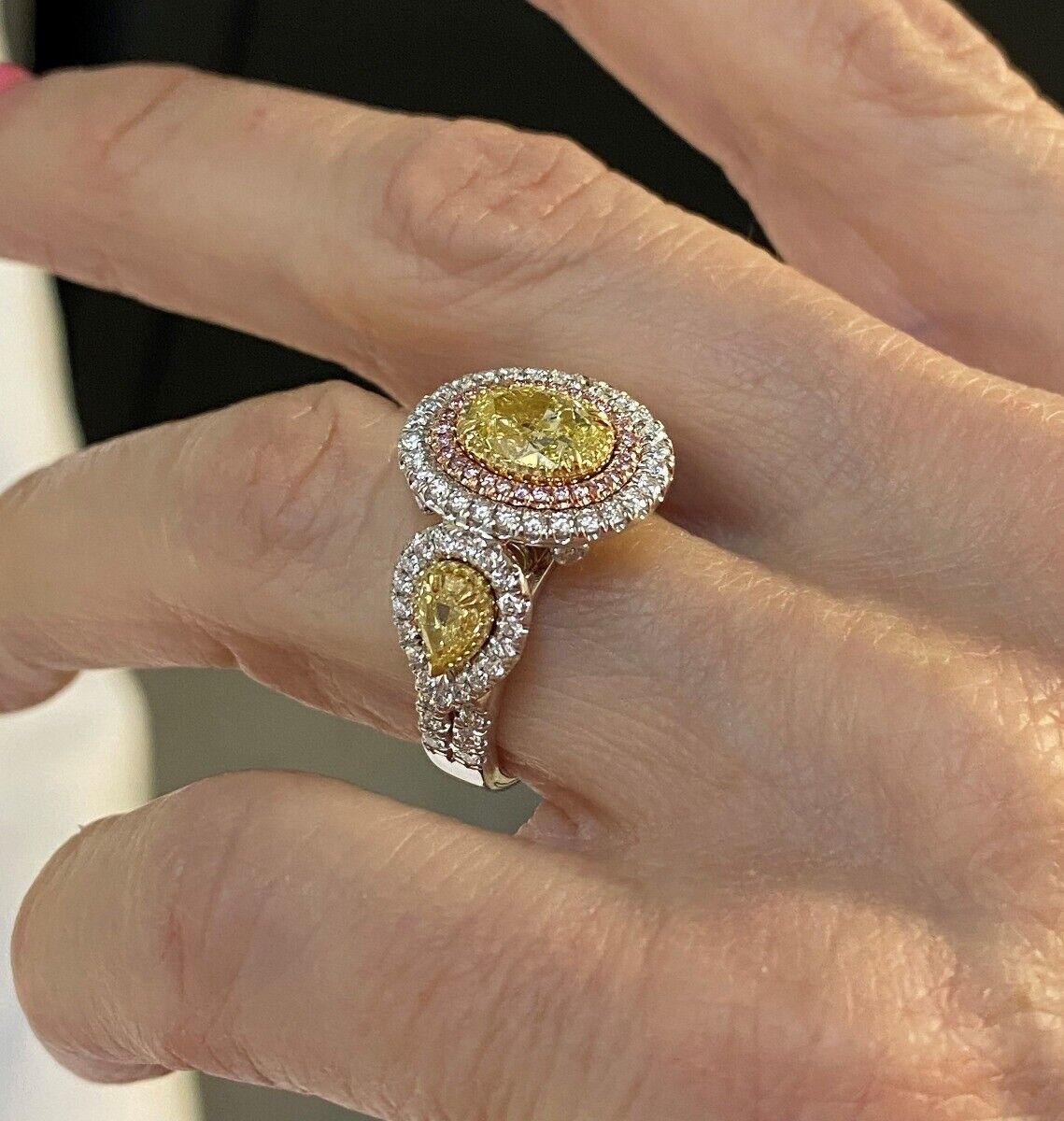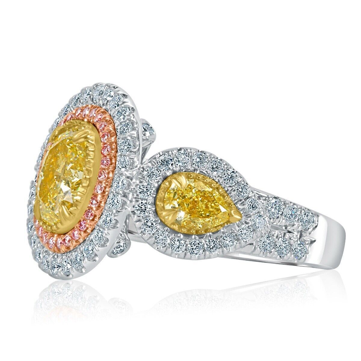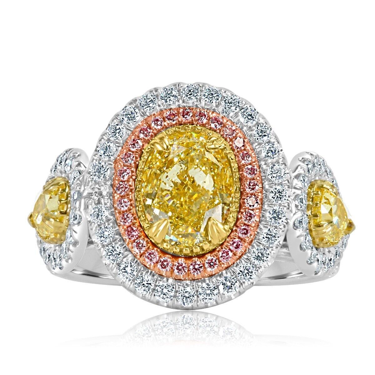 No many rings will get as much attention as this sparkler! This spectacular engagement ring showcases a 1.50 carat GIA Certified natural fancy light yellow oval brilliant cut diamond embraced by two pear shaped side natural fancy light yellow diamonds. The double halo of glittering colorless and pink round cut diamonds elegantly frames the center diamond creating a dazzling look. Handcrafted in 18 multi tone gold. The total carat weight is 3.11 carats.