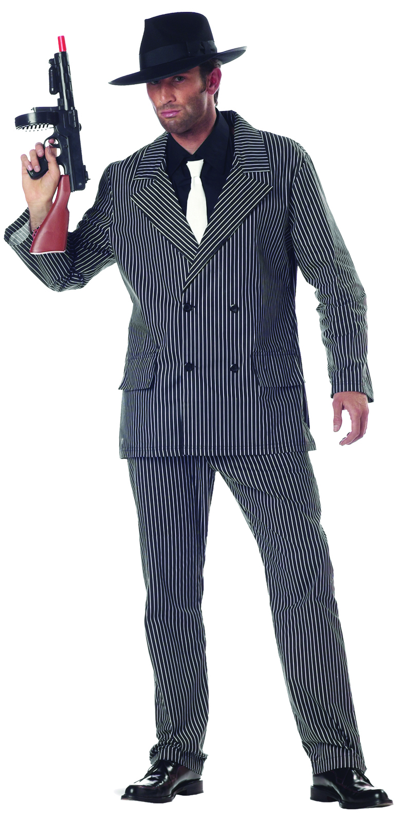 Perfect for Gatsby parties or anytime an authentic gangster is needed. Black jacket with white pinstripes and matching pants, dickey with attached tie. Large men's size fits sizes 42-44.