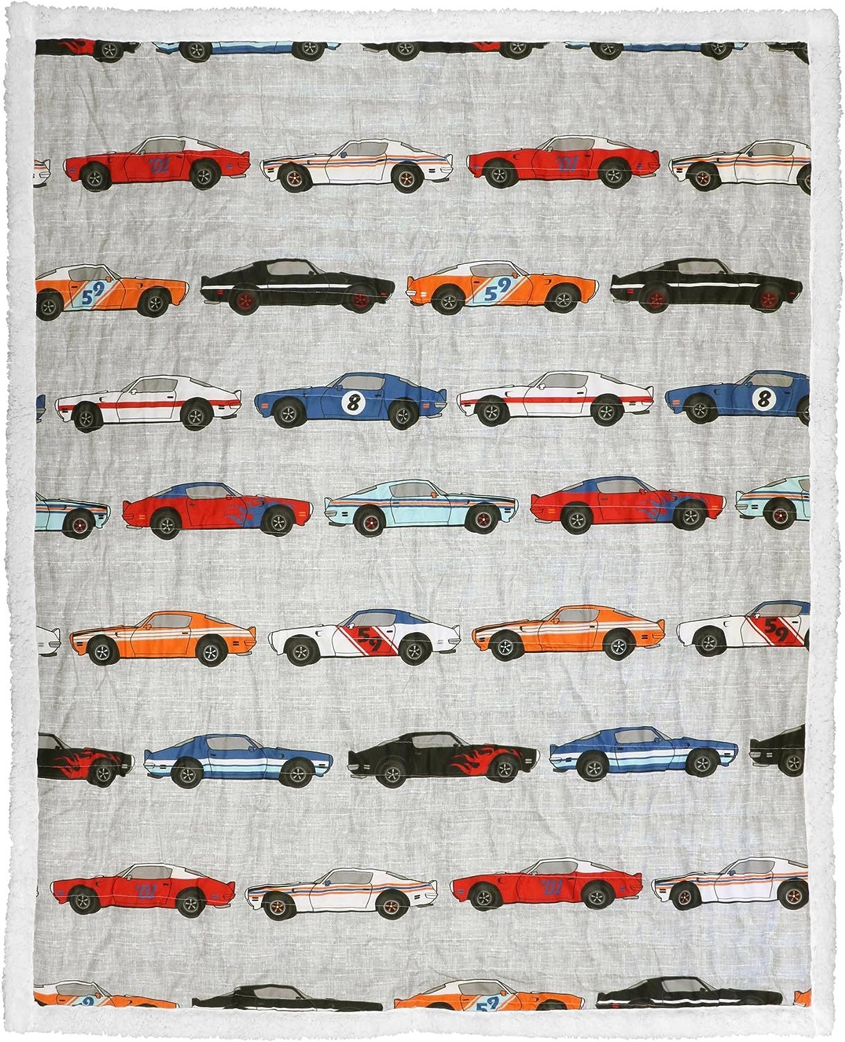 100% Polyester Imported Soft, 100% polyester fabric reversible sherpa throw measures 60? x 50?. Lush Decor Race Cars throw blanket is the ideal, fun and exciting bedding addition for any young racing fan. A perfect fuzzy blanket for the living room, foot of the bed, nursery, as a gift or lining a pet crate. Fun print pattern of multicolored muscle cars against a gray background for a cute, functional throw. Throw is easy to care for and safe to machine wash cold and tumble dry low. Do not iron.