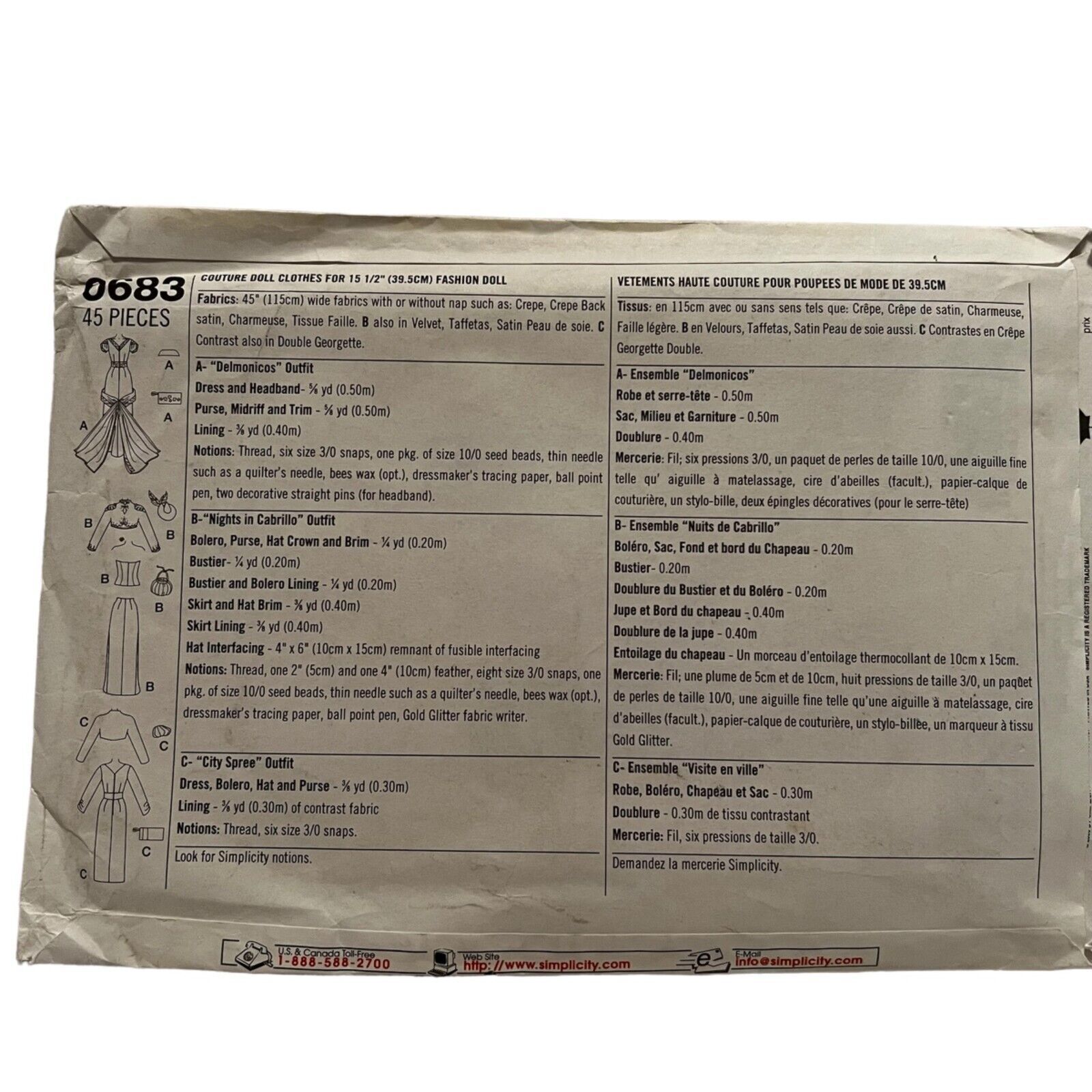 Simplicity 0683 Couturier Doll Clothes Sewing Pattern for 15.5" Dolls Uncut
