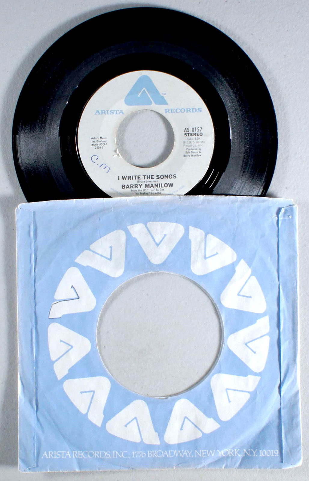 Vinyl plays with occasional light-crackles (play-graded). 7" Single. Original "Arista" cover looks good; light scuffing and fading (front/back); a name and a number written on one side of cover and inked design on other side. Minor shelf-wear along edges and corners with two tiny holes (from a staple?) near top corner. Opening is crisp but faded with some rippling and signs of use. Initials written on one side of label. (Not a cut-out.)