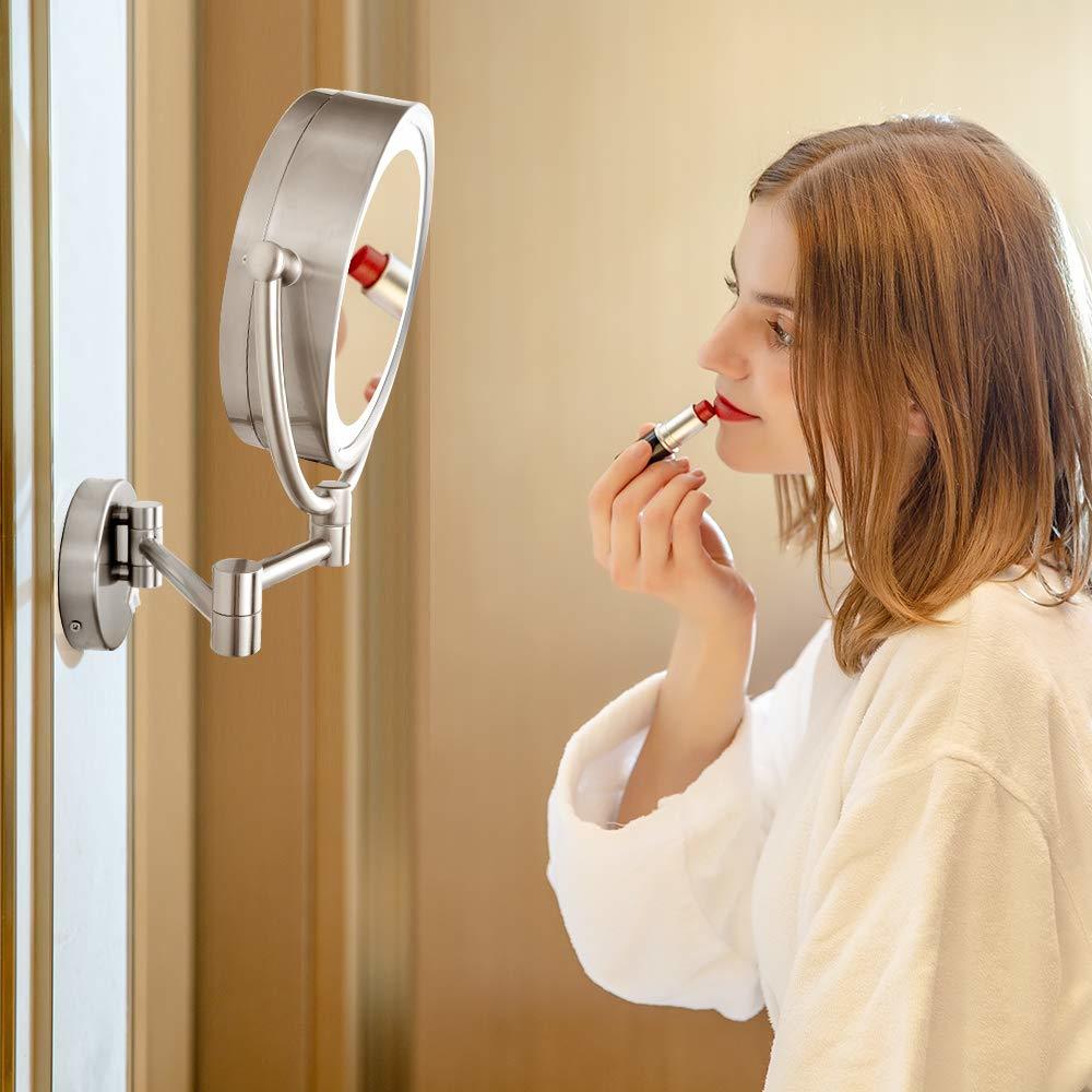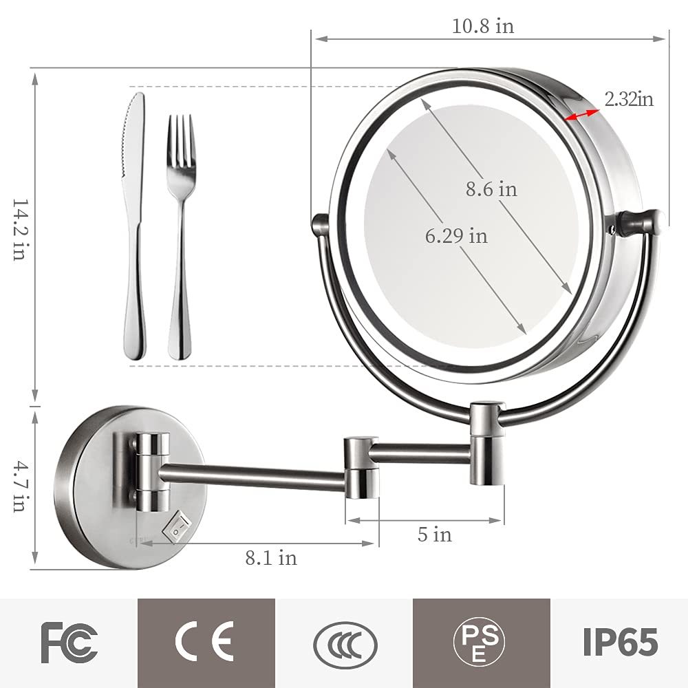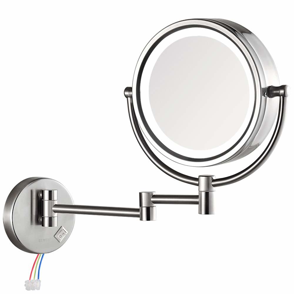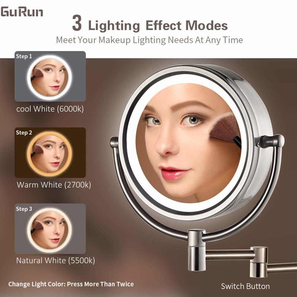 Hardwire Dual Side Mirror with Undistorted 10X Magnifying Mirror--- 1x 10x magnification mirror can guarantee all your needs, whatever you want normal imaging or focus on a specific section. This 10x magnification can give you greatly help when your make up or shaving. LED Light with 3 Color Modes- Our GURUN 1809D mirror has 3 color lighting---- Natural Daylight, Warm Yellow, Cool Light---- adjusted by pressing the button on the base more than twice, 50 LEDs in total for 3 color lighting. 25 LEDs illuminate in one time. Extending Arm and Fordable Design- This mirror is designed with an extending arm that you can smoothly extend and fold, so you can use this mirror at any angle, This design also can help you to save space.All swivel joints only can swivel 360 degree to the same direction,the wire maybe disconnect if swivel overstep 360 degree. Solid Quality and Easy to install--- Every single mirrors are made of high quality BRASS, We select the best materials then careful processing, and finally by manual assembly. The installation process is very simple, mirror will come with Installation instructions and installation parts. Super Durable Light strip and 1-year Warranty--- The Light strip won?t get hot with prolonged use and has 50,000 hours life, that is an hour per day, every day, for around 135 years.