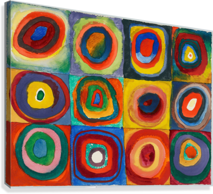 "Quadrate mit konzentrischen Ringen" is an abstract composition featuring colorful squares arranged in a dynamic and rhythmic pattern, with concentric rings adding depth and movement to the composition. The painting exemplifies Kandinsky's exploration of non-representational art and his belief in the spiritual and emotional power of color and form.