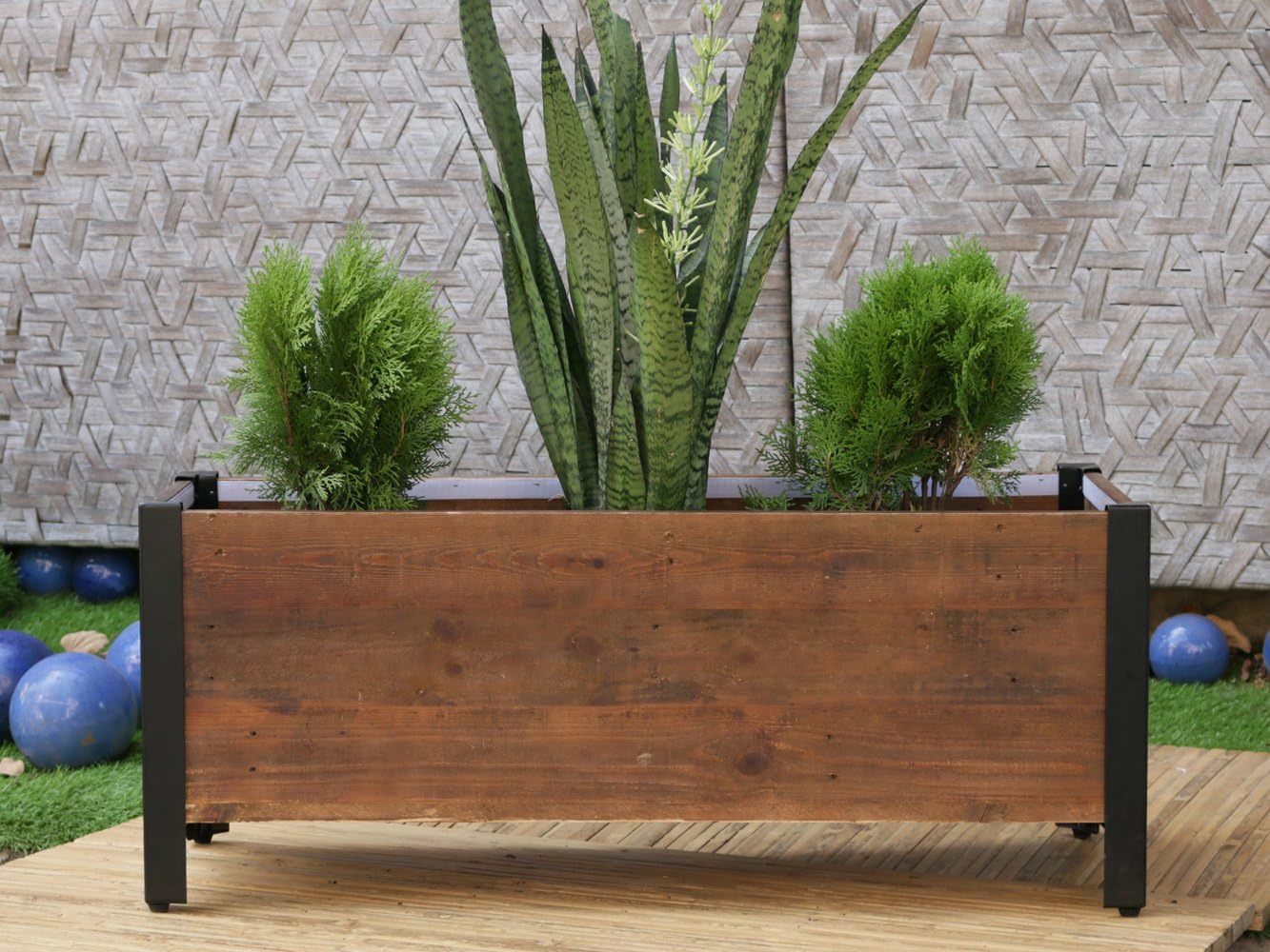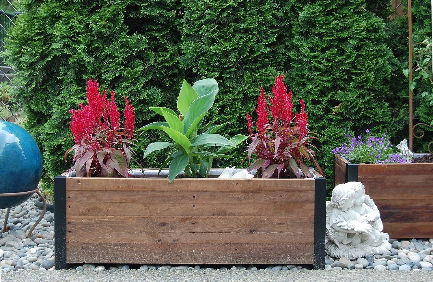 Earth-friendly planter made from recycled pine pallets Powder-coated Steel frame for durability Attractive powder-coated Black Steel legs Includes plastic liner 31 gallon capacity