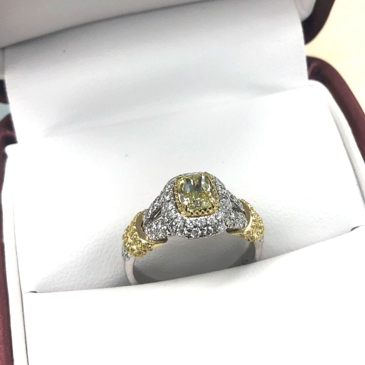 GIA 1.48 CT Cushion Natural Fancy Yellow Diamond Ring 18k White Gold