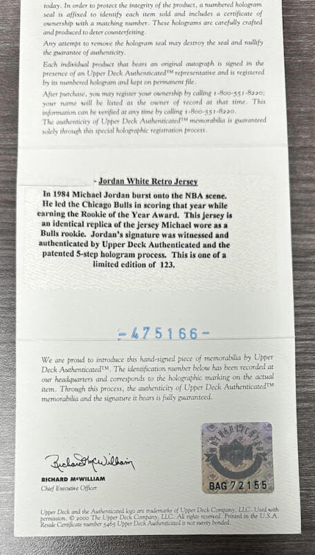 Jordan's signature is guaranteed authentic through the Upper Deck Authenticated serial numbered hologram system.