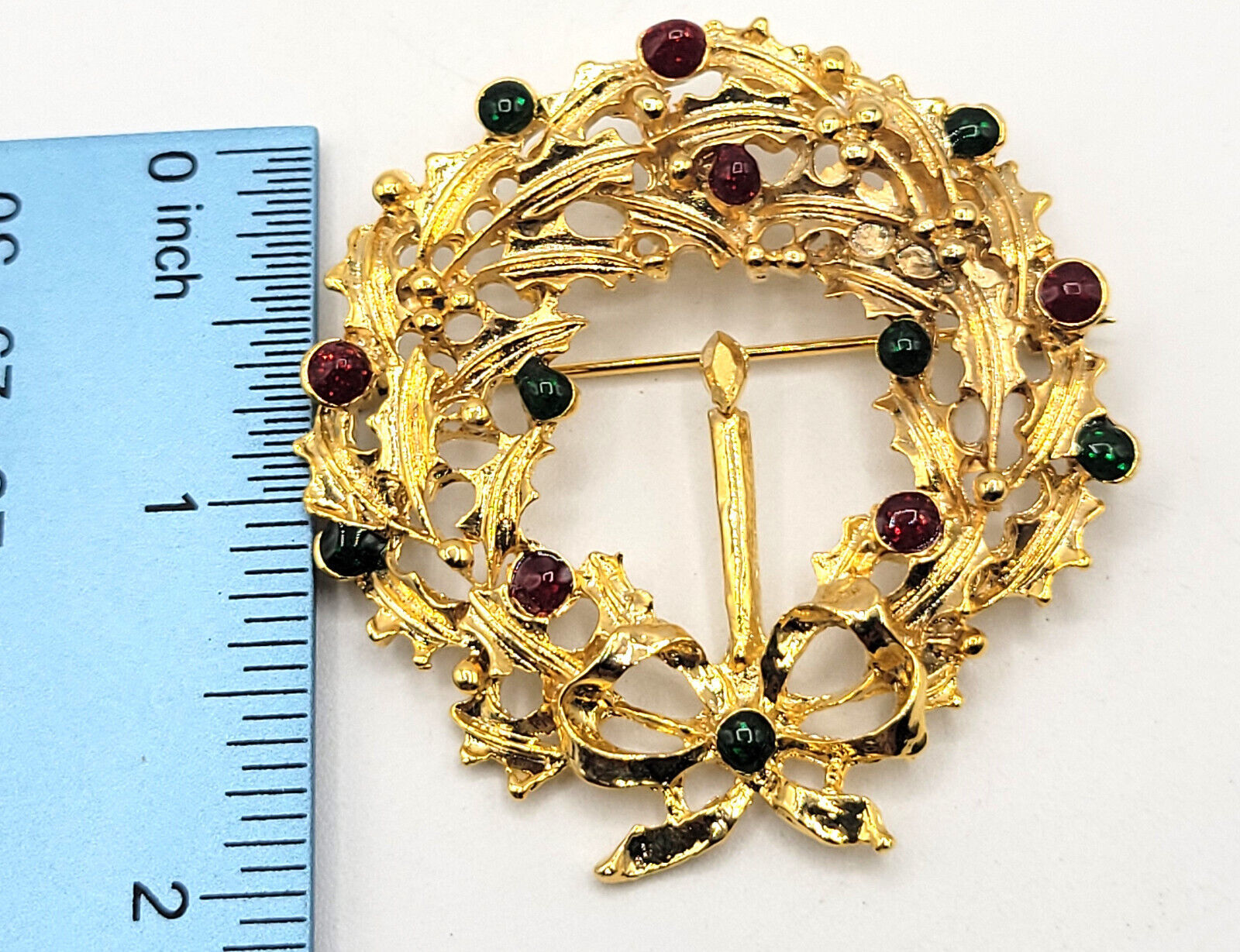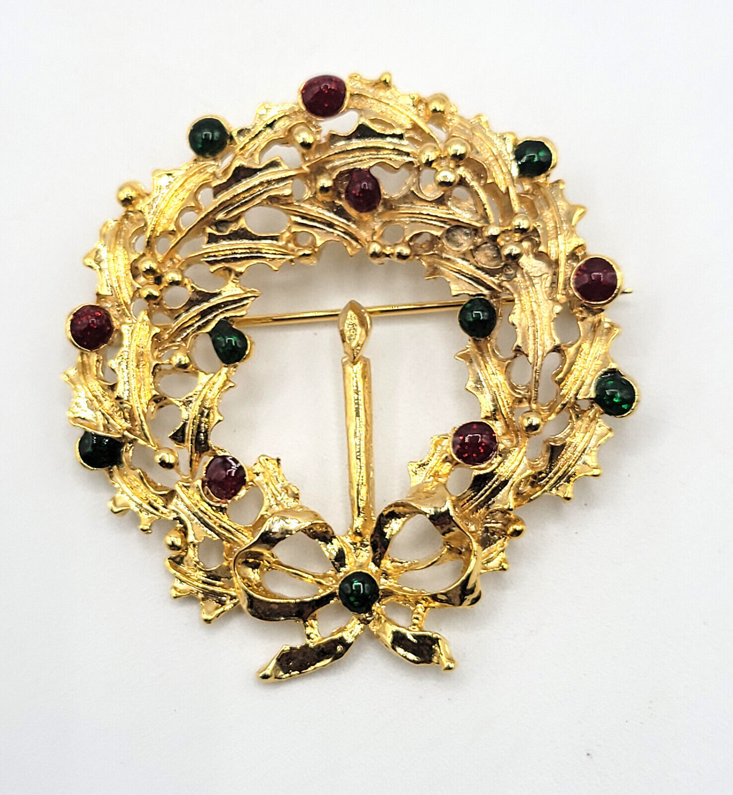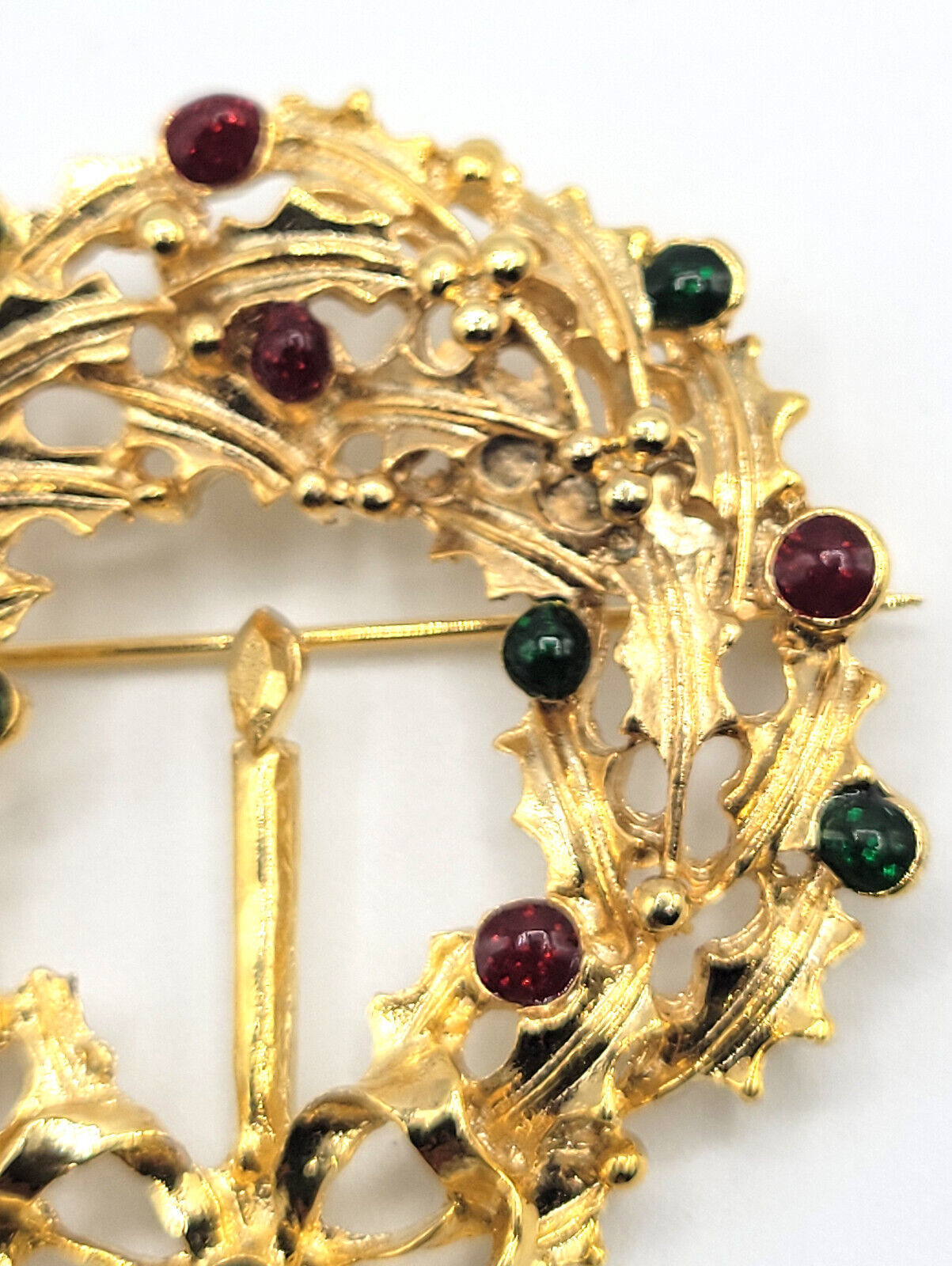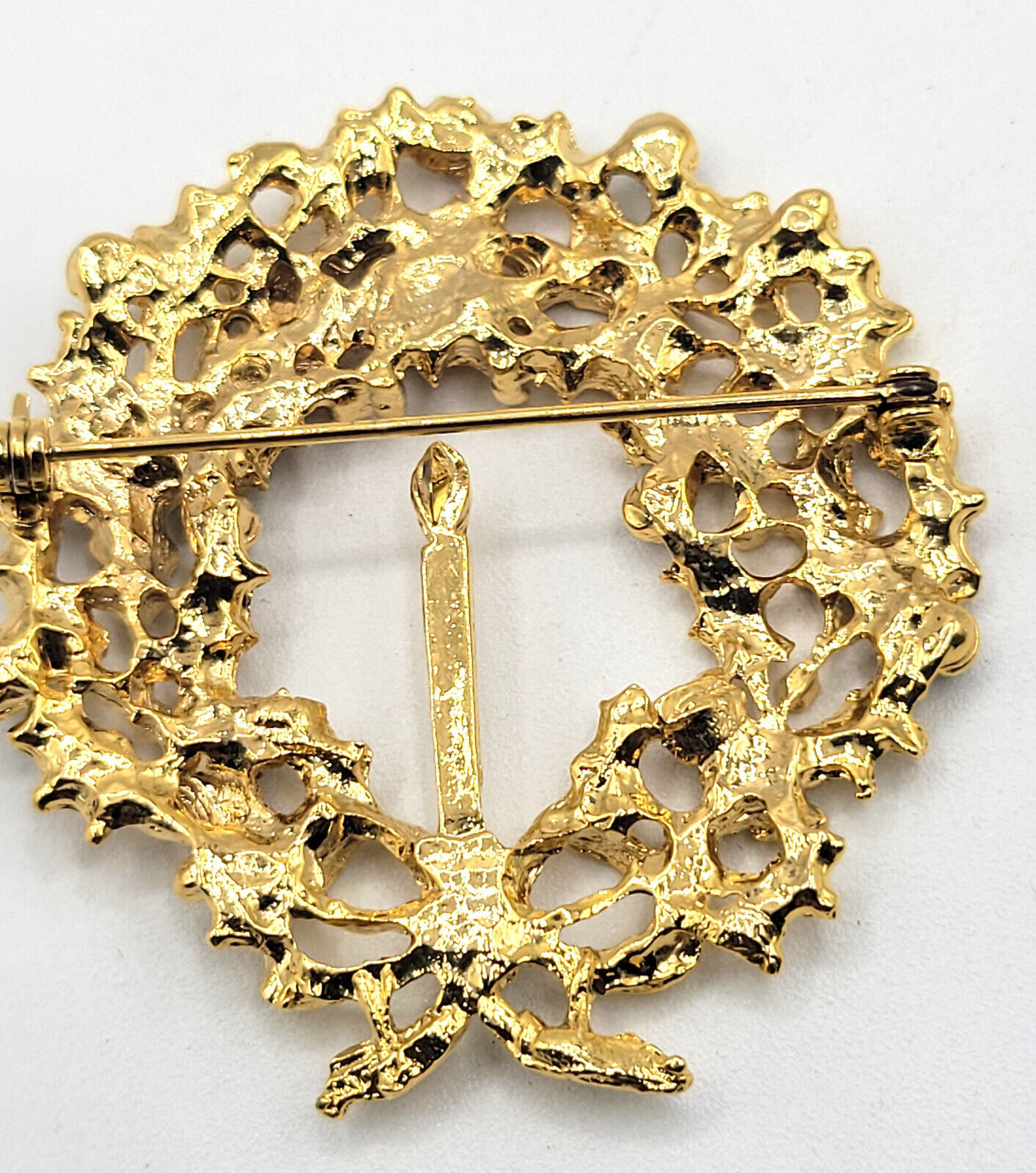 Christmas Holiday Pin Brooch Gold-tone Filigree Wreath Candle Red Green Stones