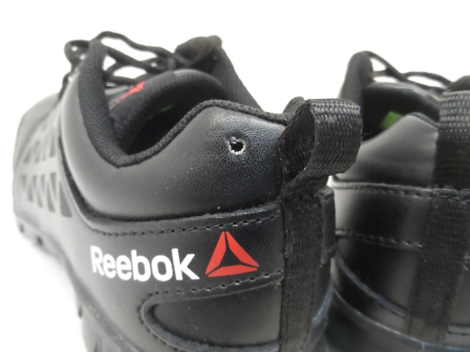 THERE IS A MINOR HOLE ON EACH SHOES BACK HEEL THAT GOES ALL THE WAY THROUGH INTO THE SHOE - MINOR ISSUE AND SHOULDN'T AFFECT PERFORMANCE OR COMFORT OF THE SHOE