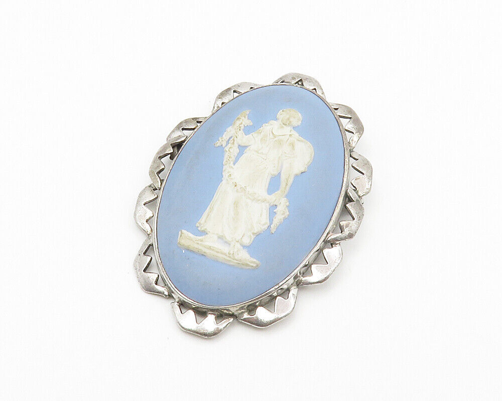 925 Sterling Silver - Vintage Carved Figure Blue Cameo Brooch Pin - BP5305