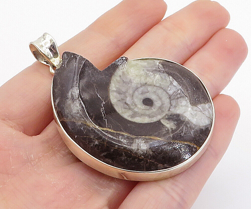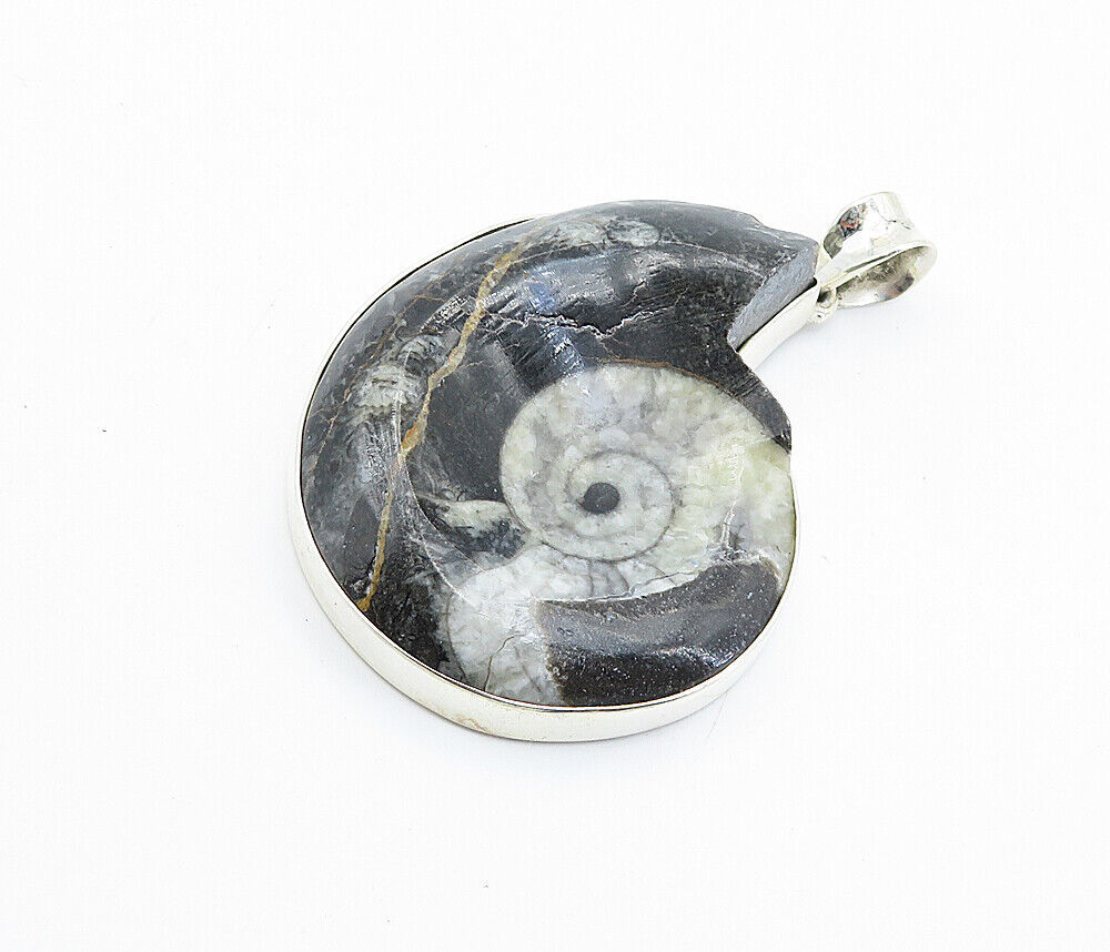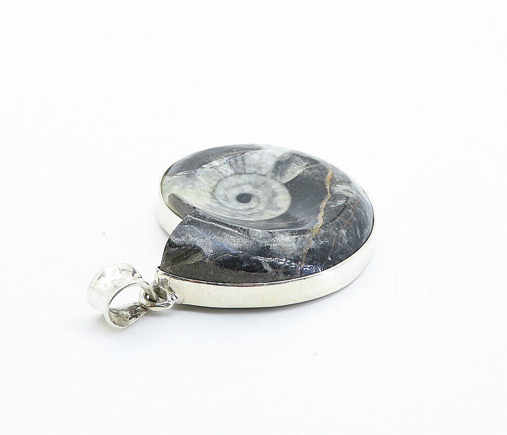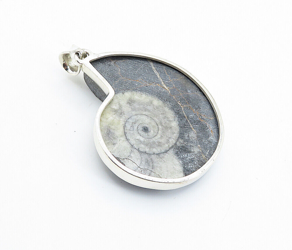 925 Sterling Silver - Vintage Grey Jasper Swirl Shell Drop Pendant - PT6062