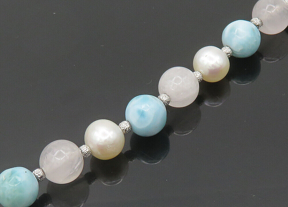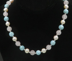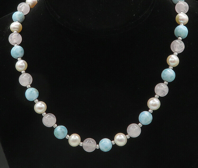 925 Silver - Vintage Pearls Rose Quartz & Larimar Beaded Chain Necklace - NE3385