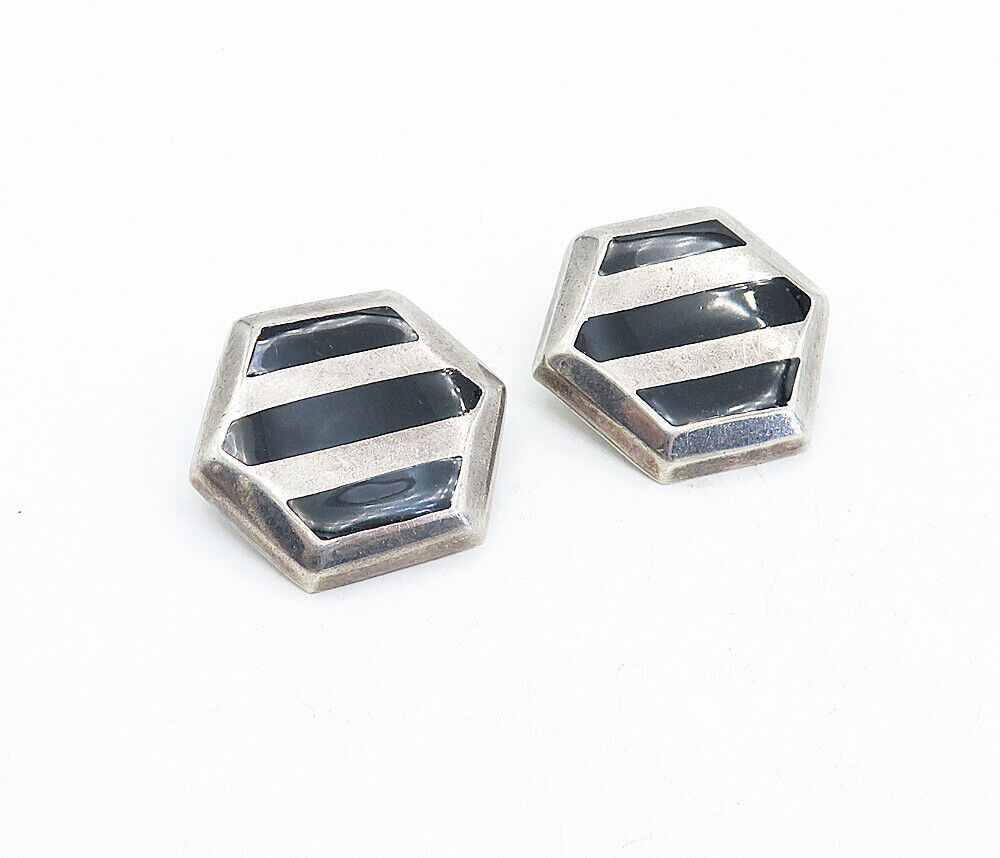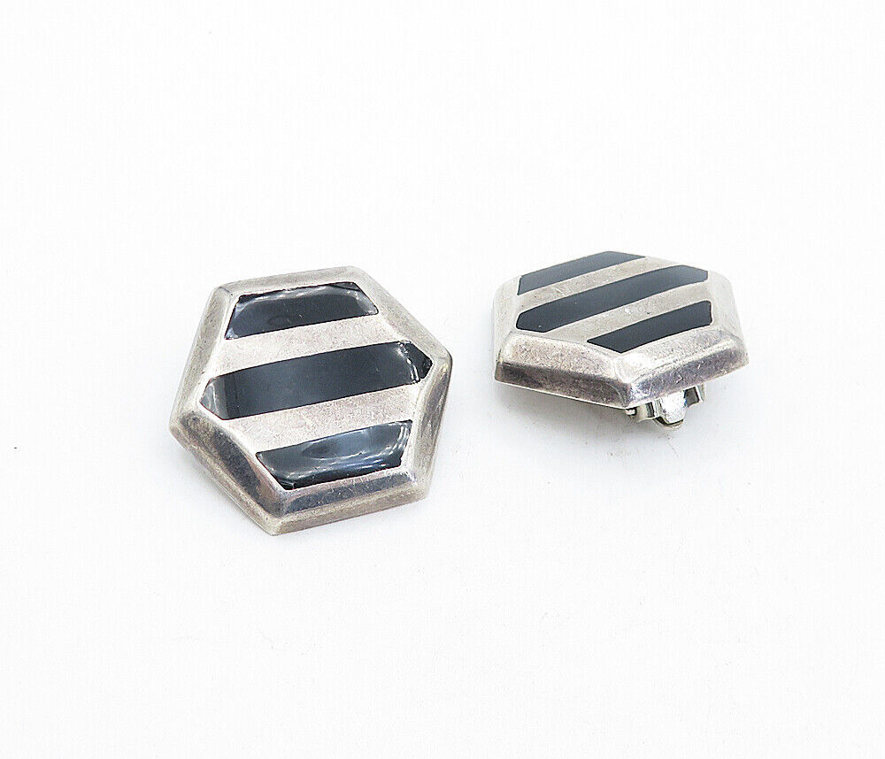 MEXICO 925 Silver - Vintage Black Onyx Striped Non Pierce Earrings - EG2172