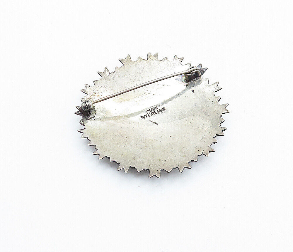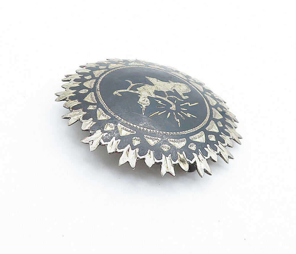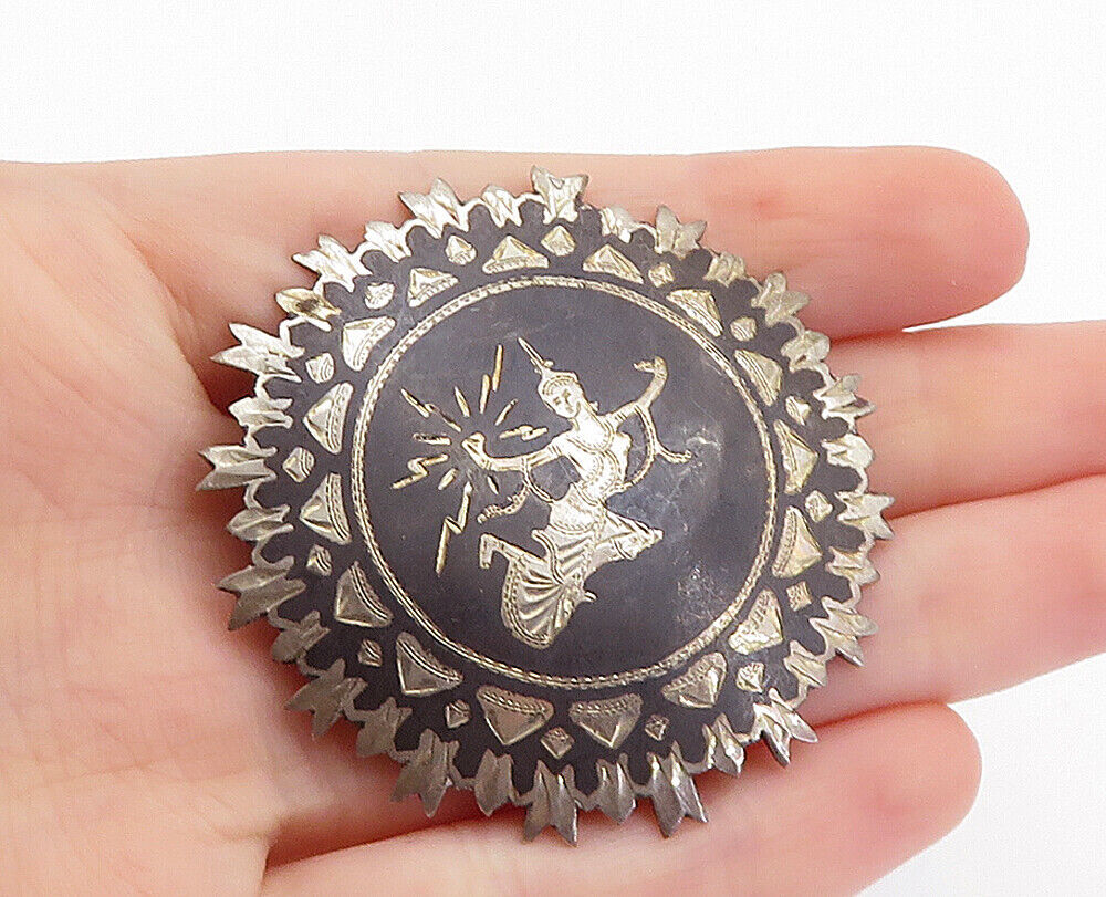 SIAM 925 Sterling Silver - Vintage Niello Dancer Round Brooch Pin - BP2462