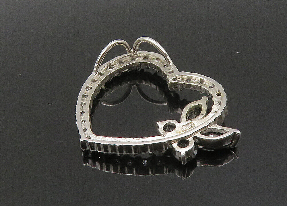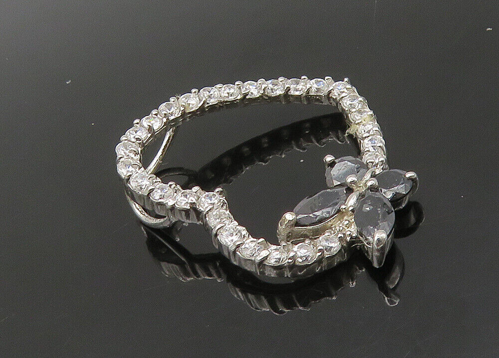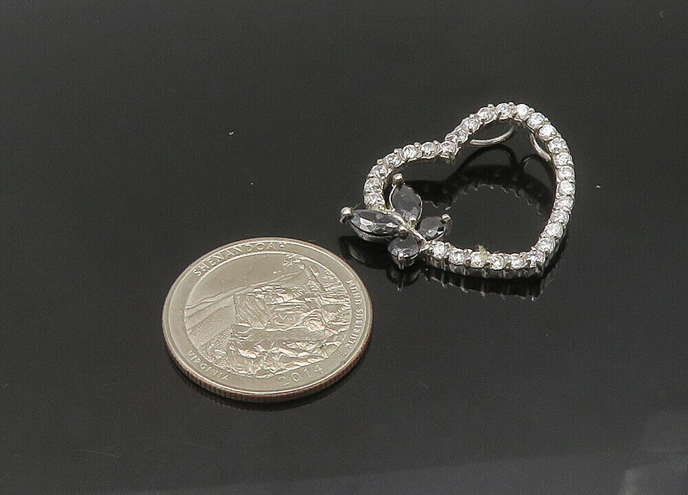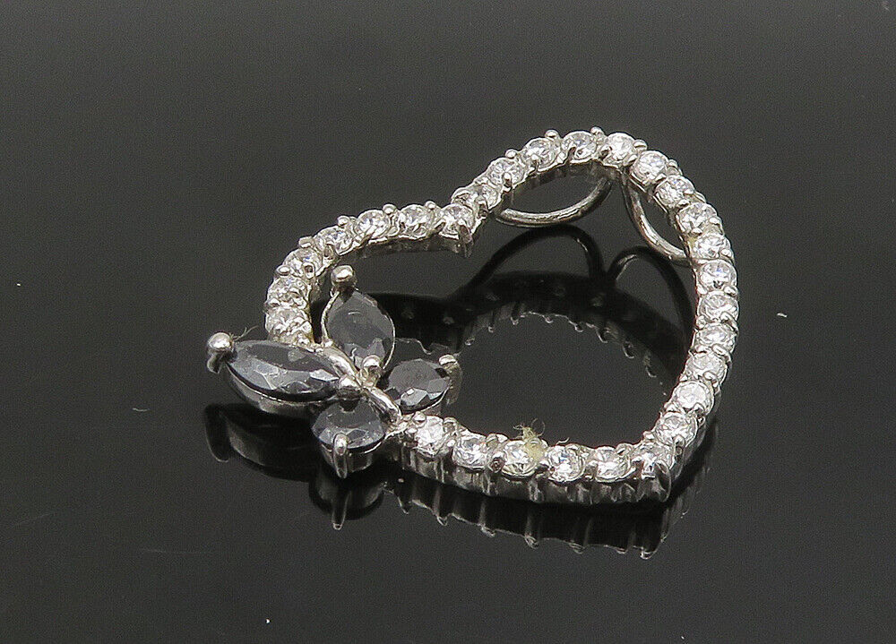 925 Silver - Vintage Cubic Zirconia & Sapphire Butterfly Heart Pendant - PT17083