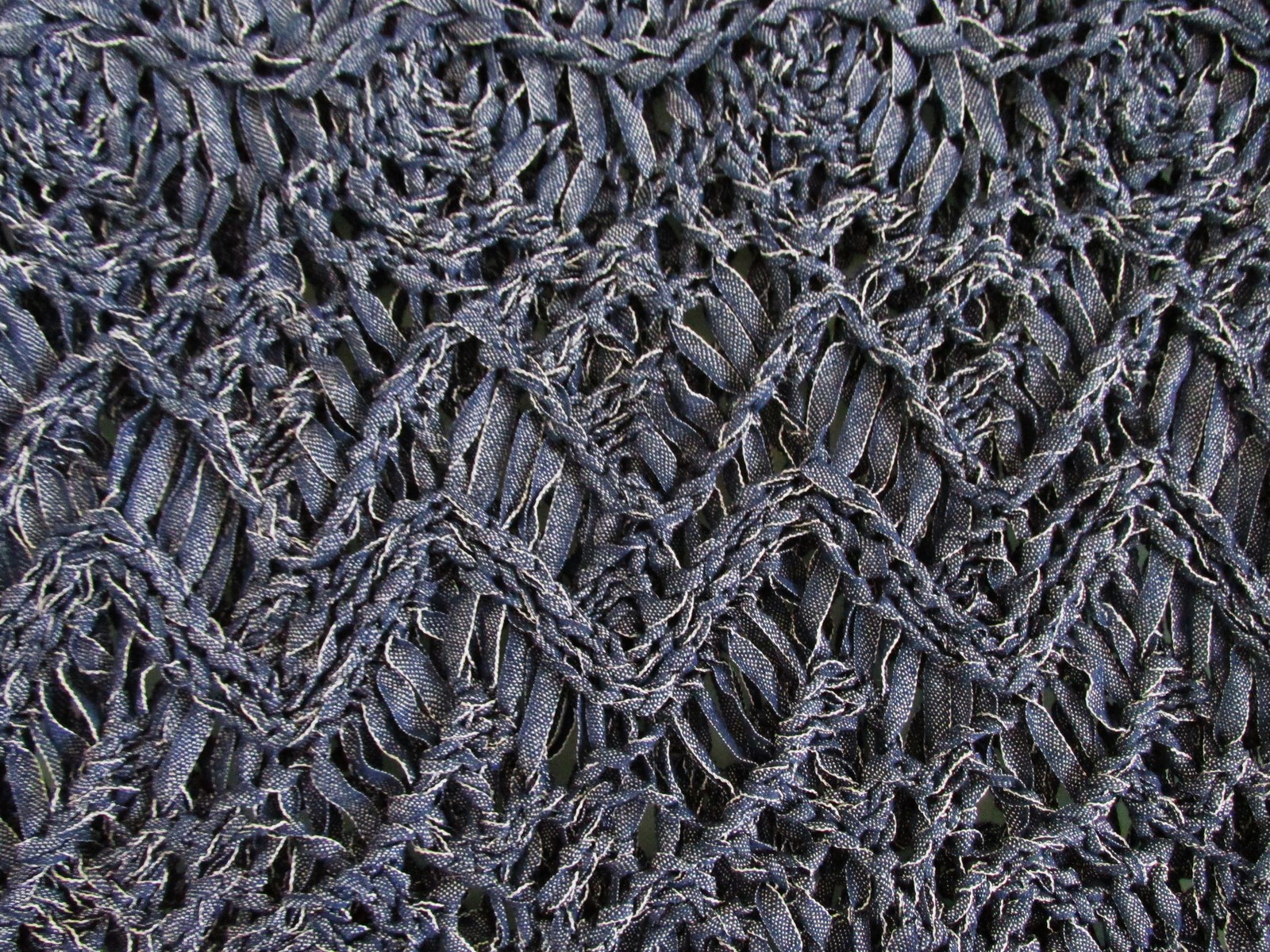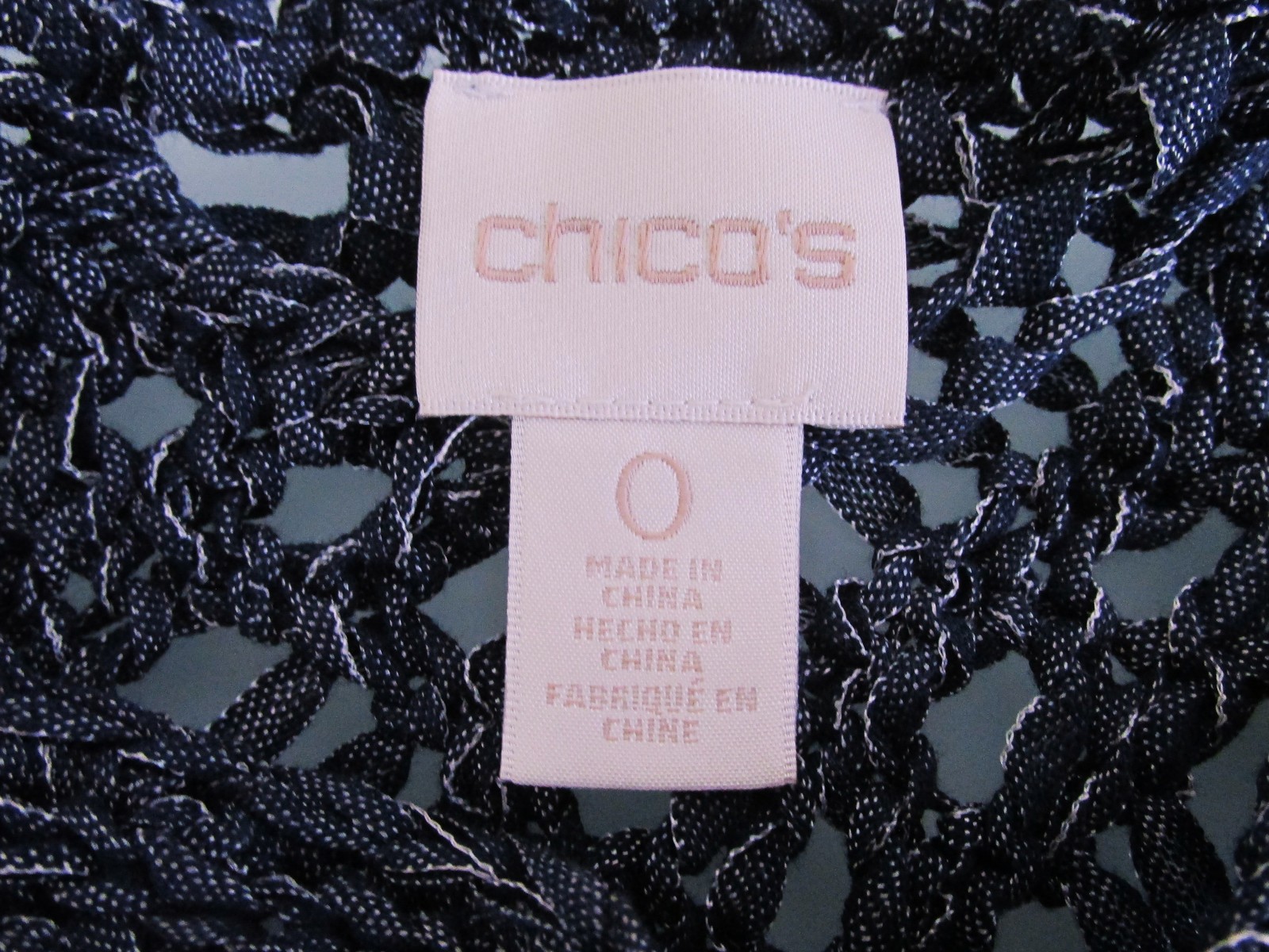 Description: Up for sale is a Chico's women's open crotched top. This top is size 0 (S). It is made of 72%cotton/28%poly. The top is blue in color with white accents. It features an open crotched pattern with half-sleeves. This top is in excellent condition.