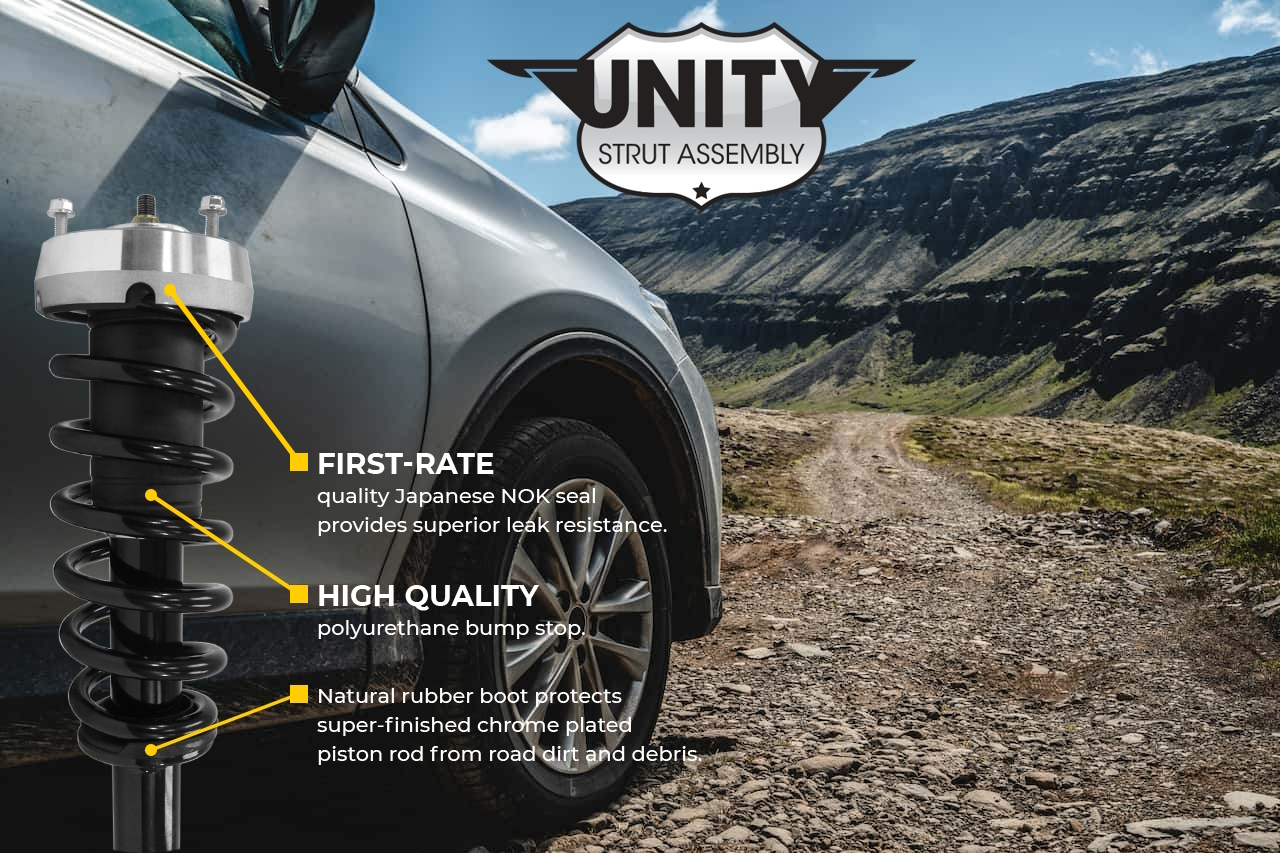 Unity Complete Strut Assembly Includes everything you need for strut replacement in a single, fully assembled unit with no need for a spring compressor Precisely calibrated to meet the OE design, each application-specific coil spring type is engineered to restore ride height and support the vehicle's weight Application-specific coil spring, mount and strut designs ensure optimized ride and handling experience unique to each vehicle profile Preassembled upper strut mount, coil spring, and strut feature an OE-style design for seamless fit, form, and function