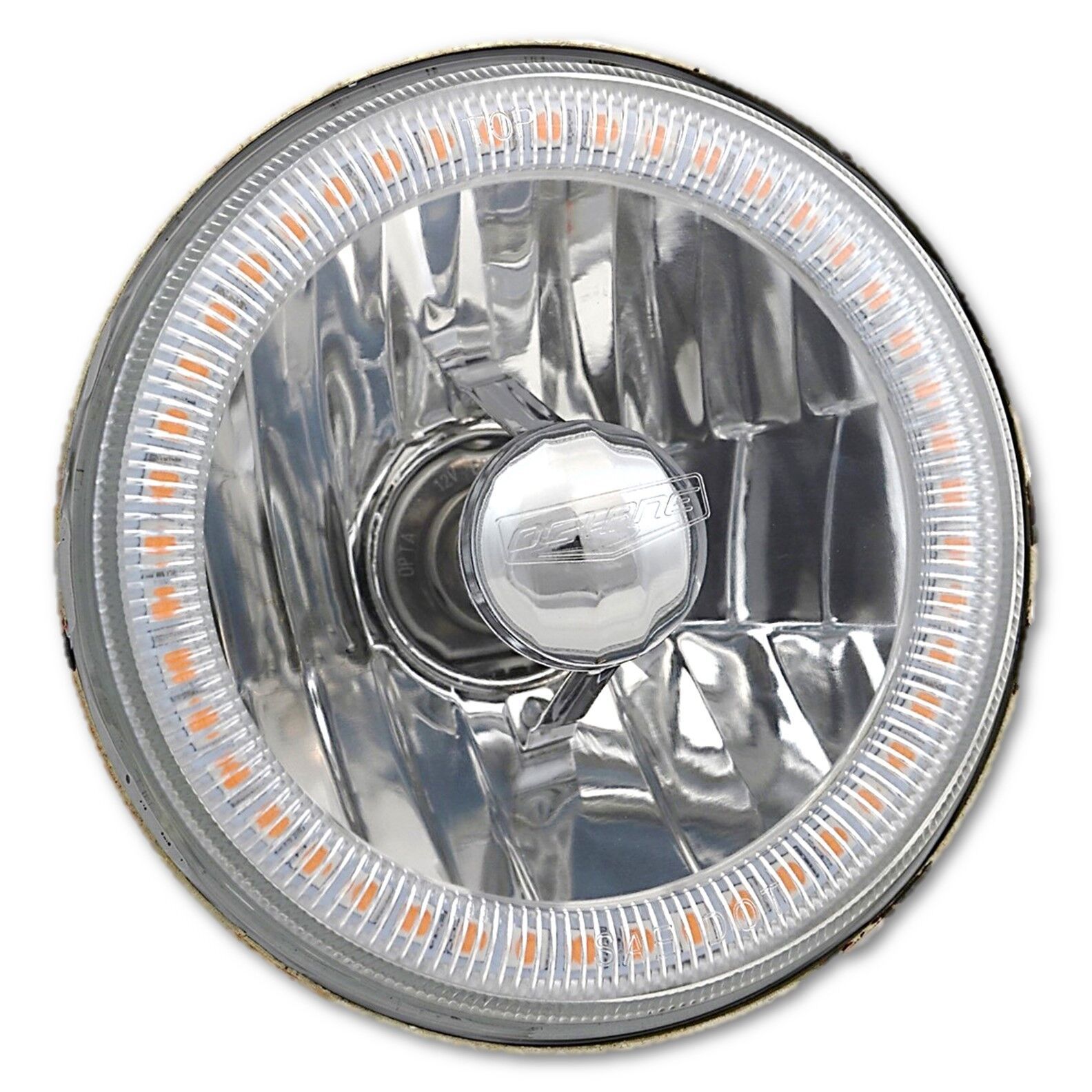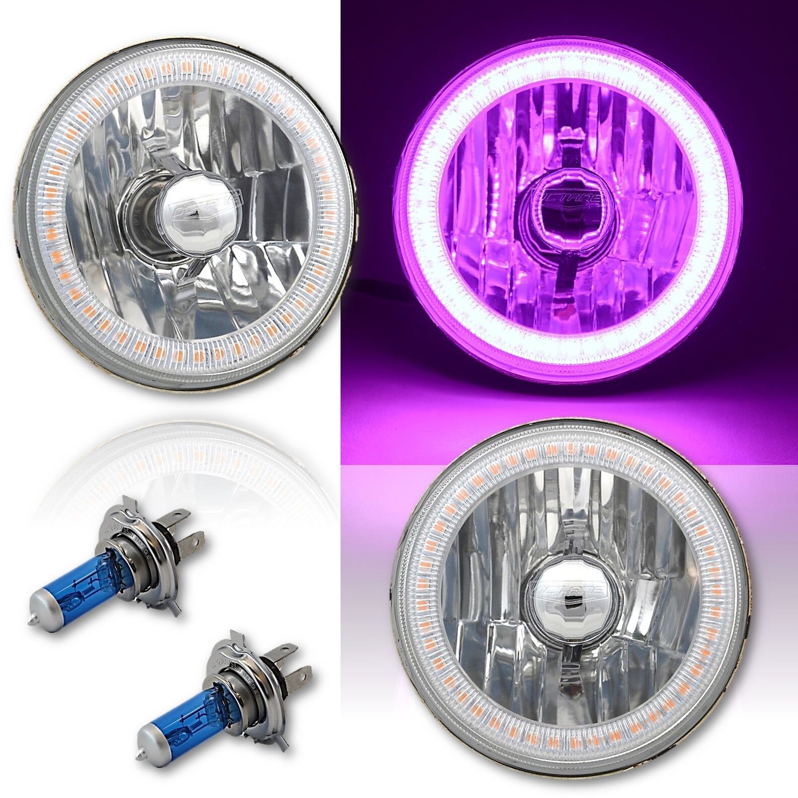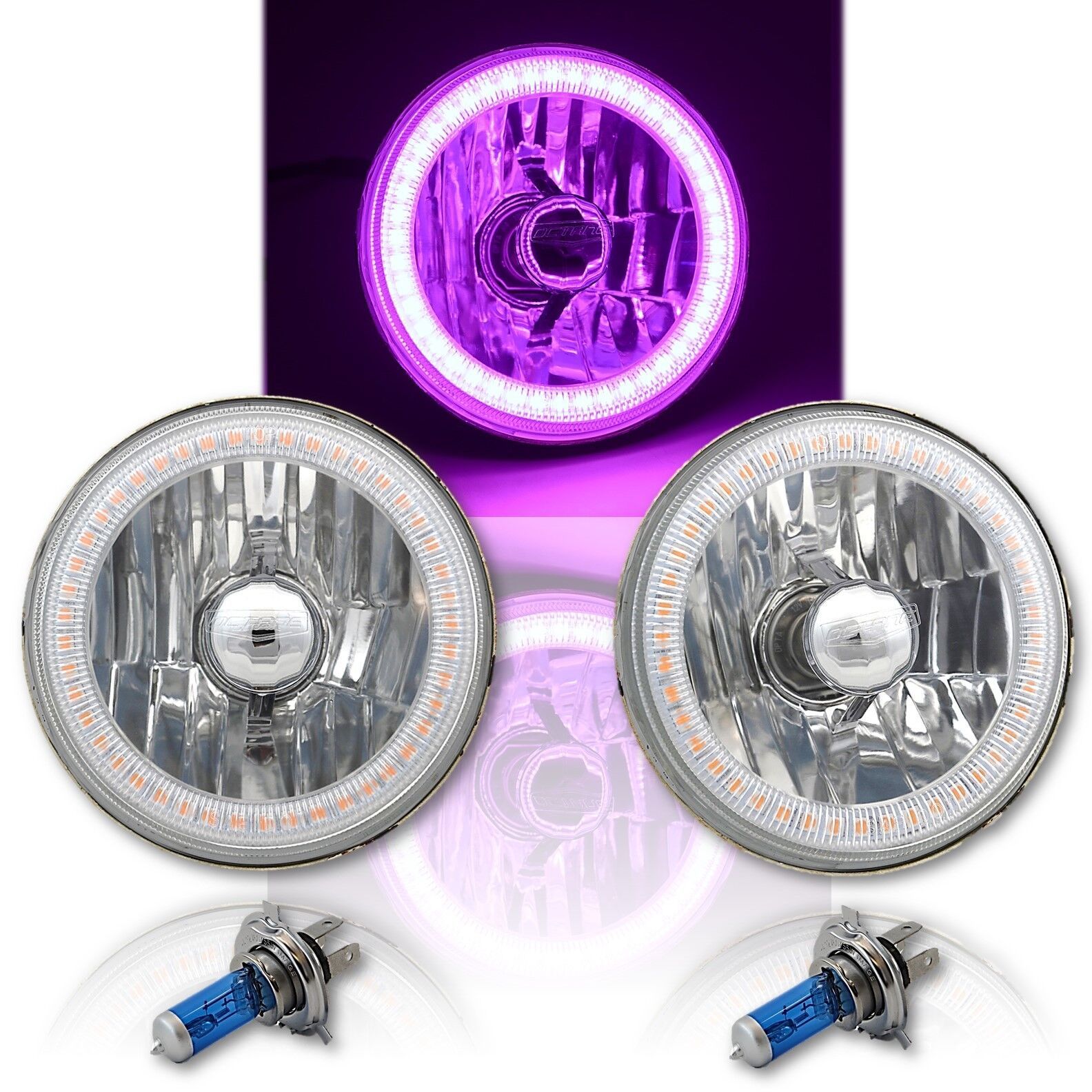 3/4" crystal clear glass faced halogen headlamp bulbs with SMD purple LED halo rings. Includes super white halogen 60/55w H4 bulbs.