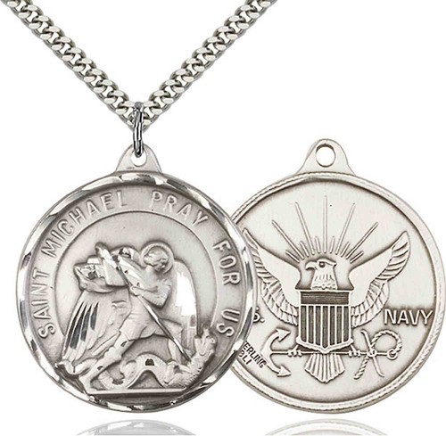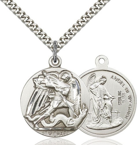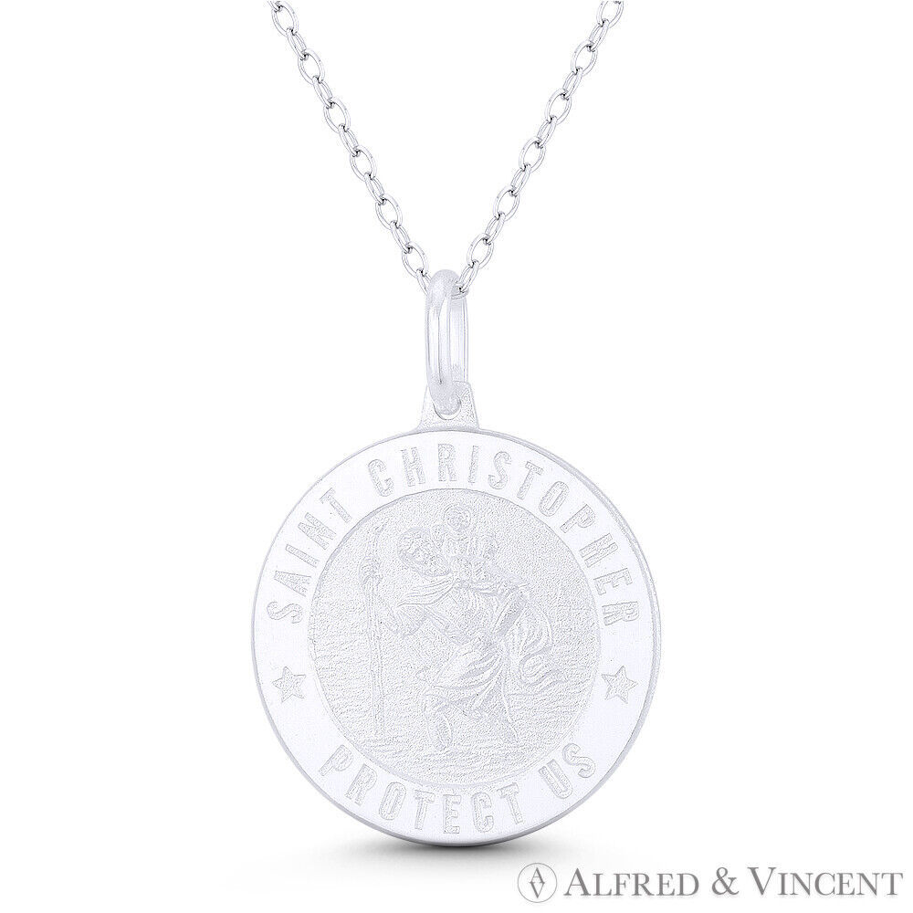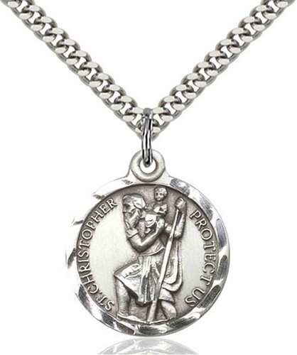 The featured Italian-made pendant is cast in .925 sterling silver and showcases a 21mm (0.8in) round medallion detailed with an image of St. Christopher surrounded by engraved text. The medallion is then finished with a sturdy bail that can accommodate most average-sized chains.