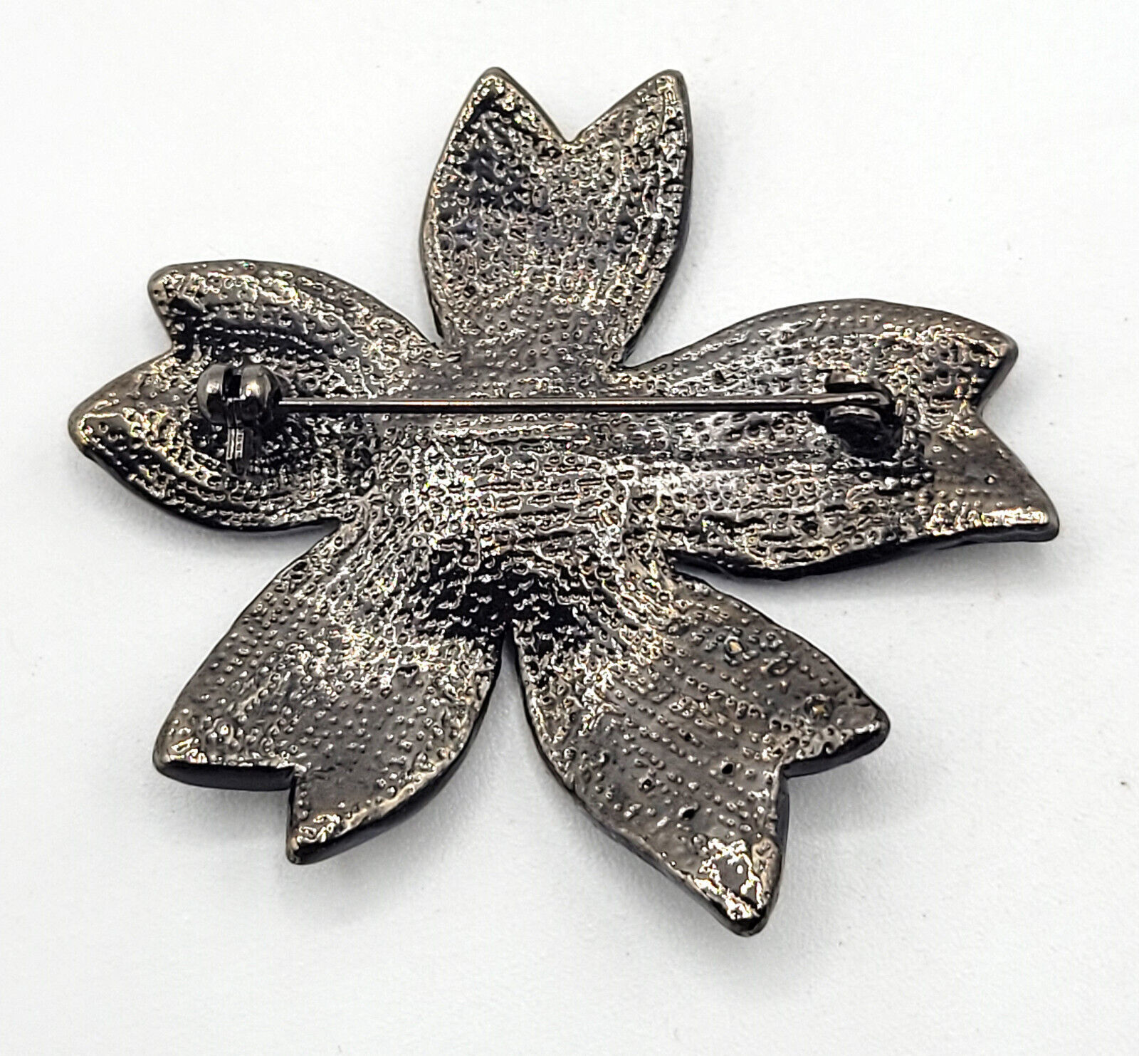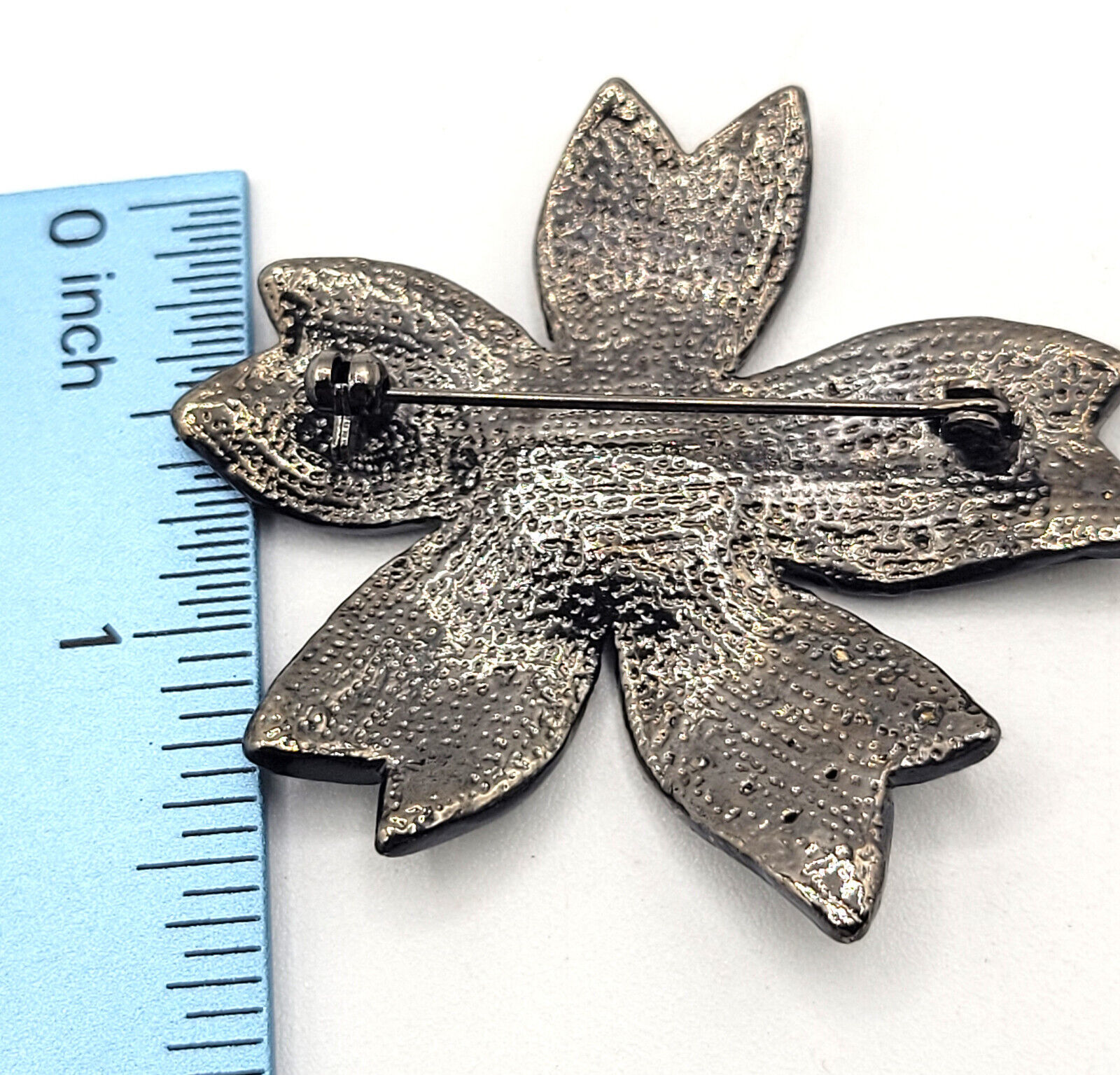 Spooky Black & Aurora Flower Pin Brooch Enameled Glass Rhinestones Estate 1.5"