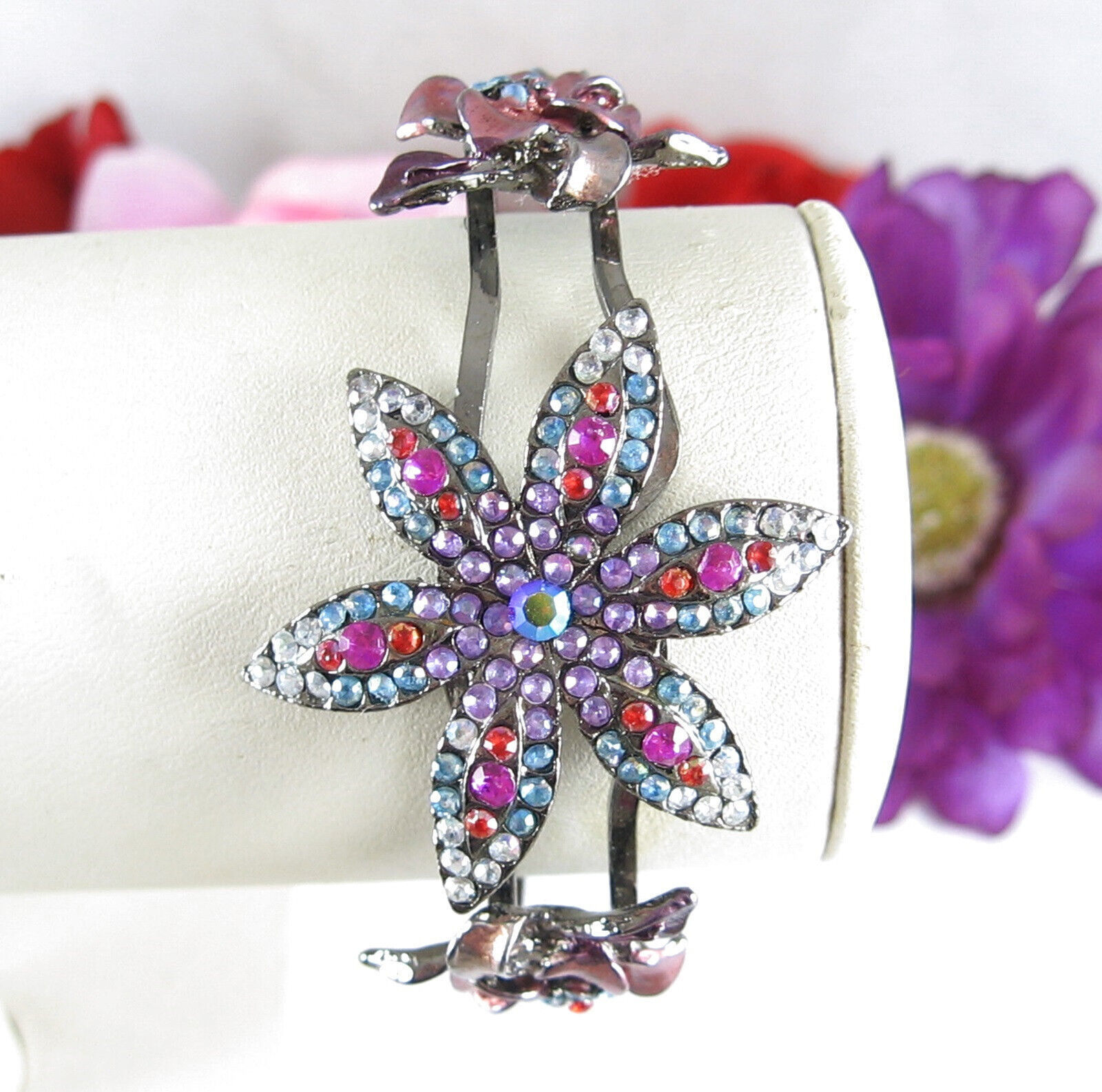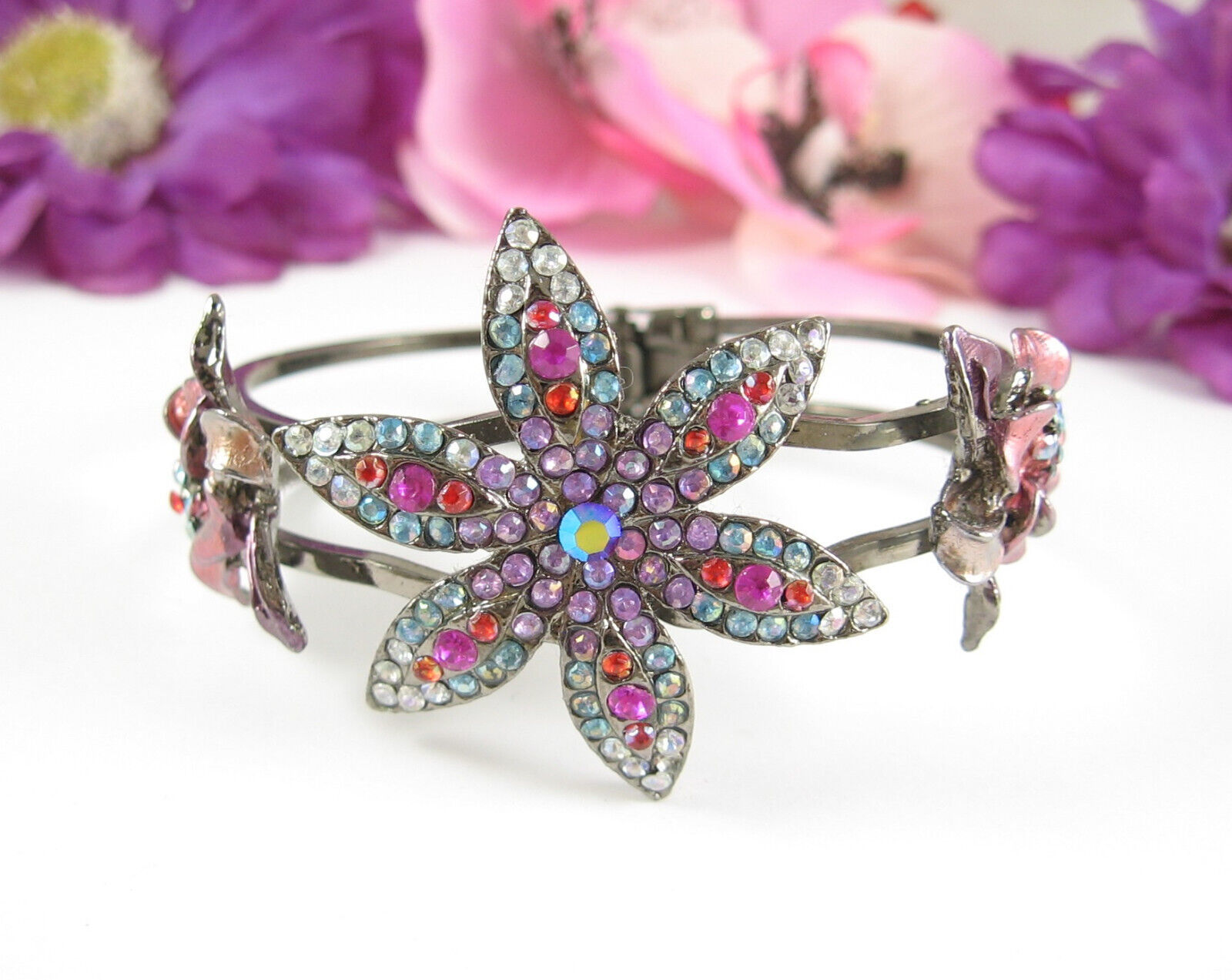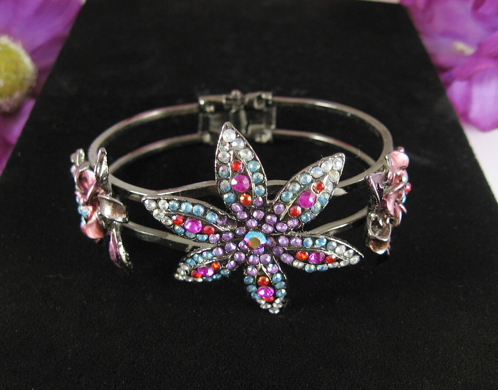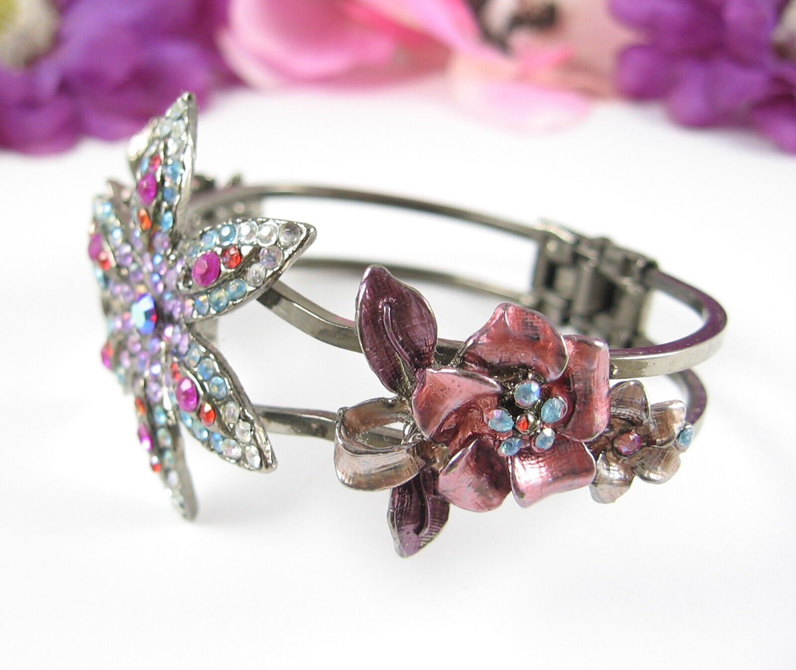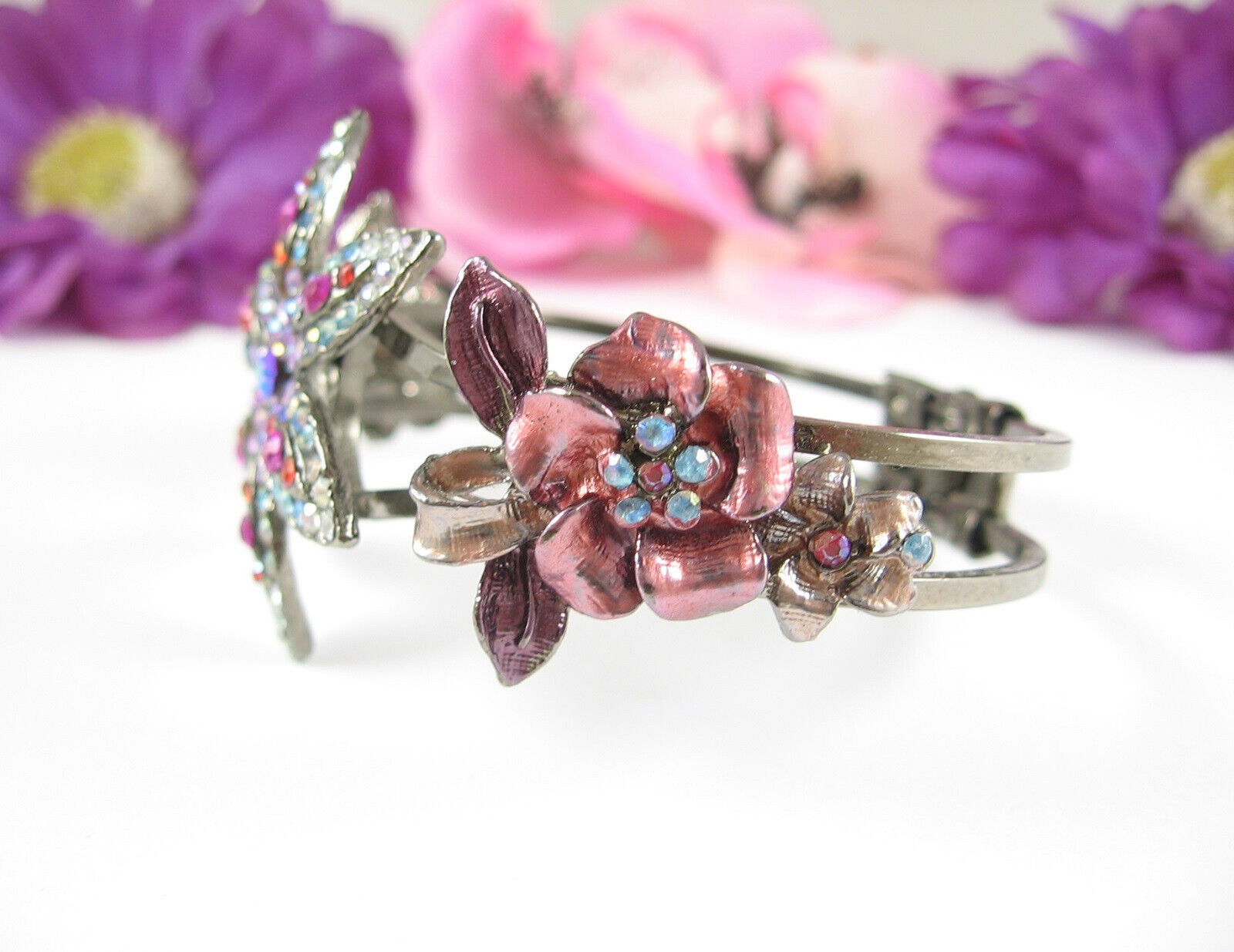 Color RHINESTONE CLAMPER BRACELET Vintage Flowers Pink Purple Gunmetal Gray